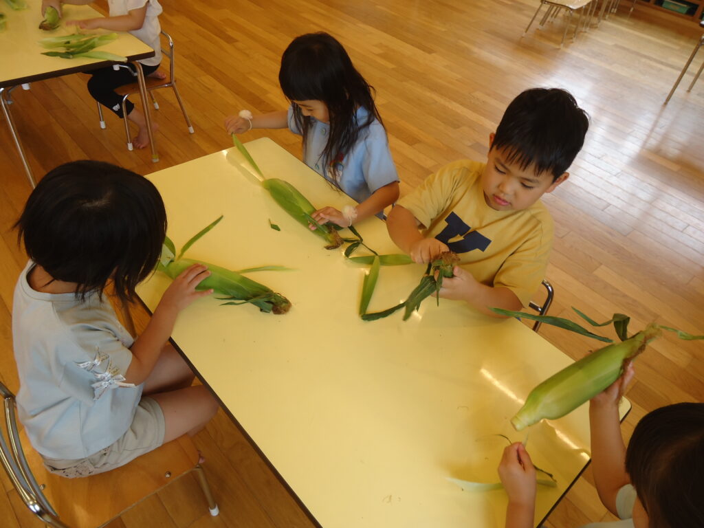給食先生から明日のおやつに出すとうもろこしの皮むきをお願いされた年長組さん、