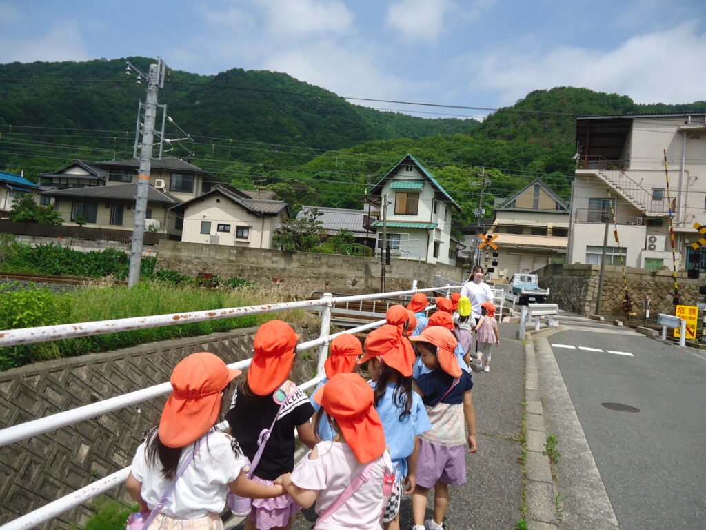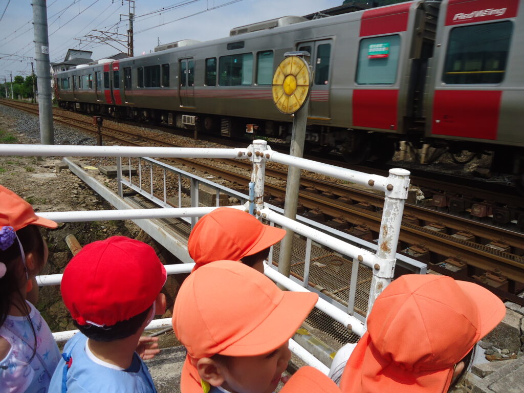 近くを通る電車に釘付けの年中組さん👀「速いね~!!」、「風凄い!!」と電車が通り過ぎるのをじーっと見ていました。