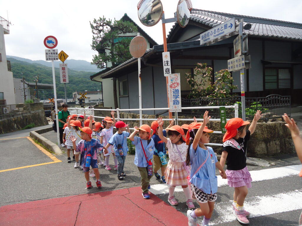 踏切の後は横断歩道。先週交通安全教室で習ったことを思い出しながら、手をあげて、右見て、左見て、もう一度右を見て、車が来ないかを確かめながら渡りましたよ。👏👏