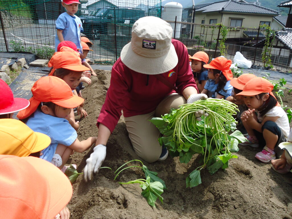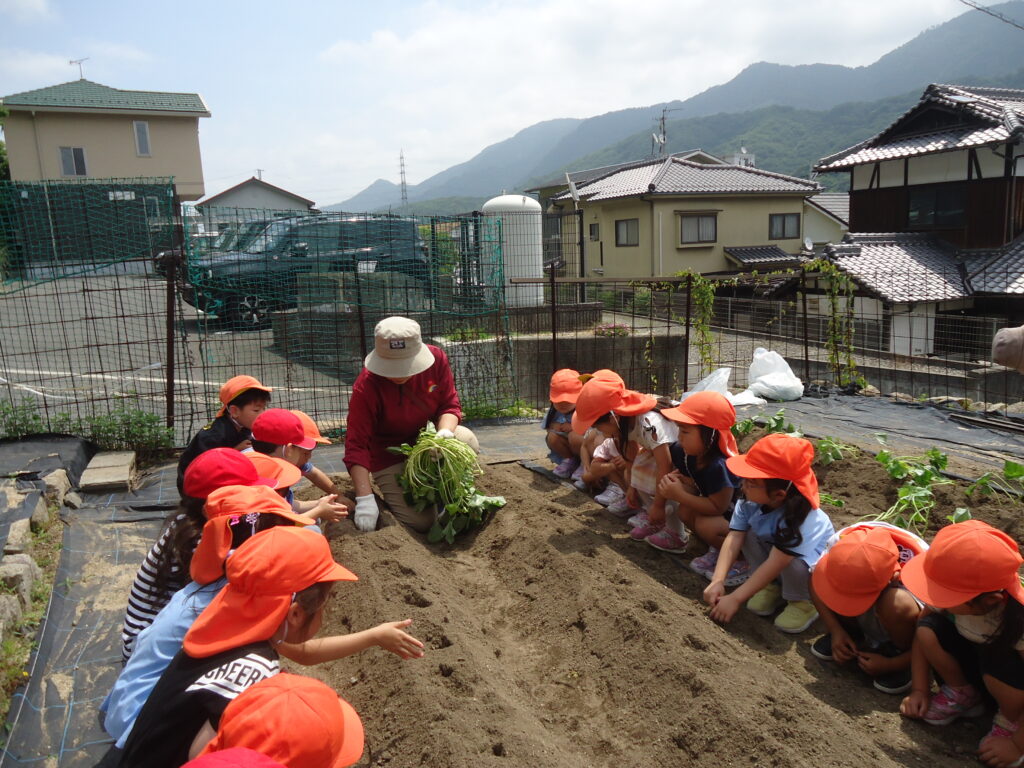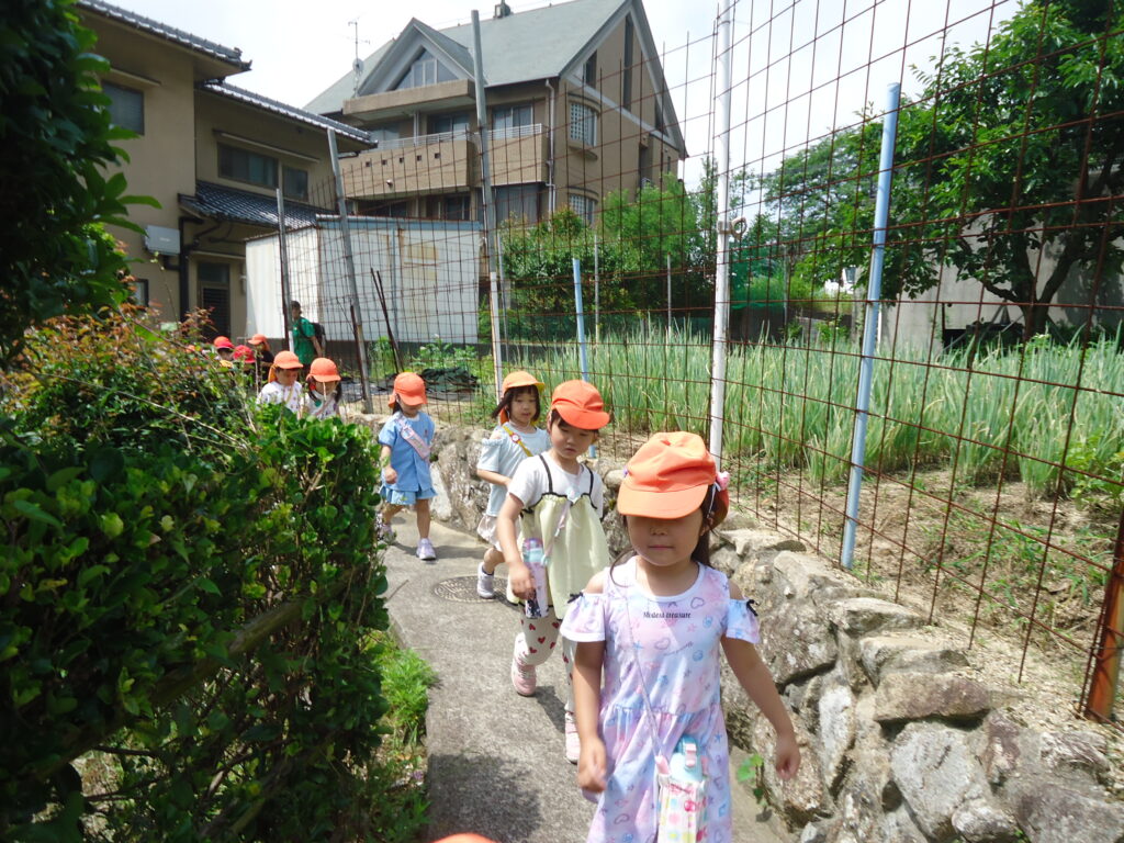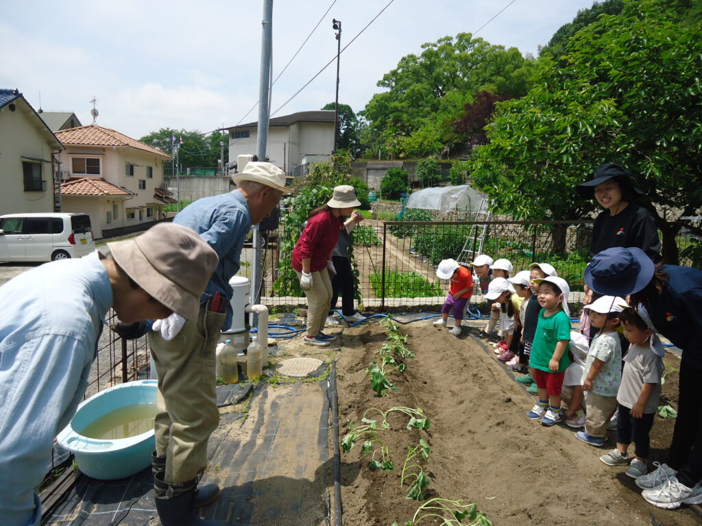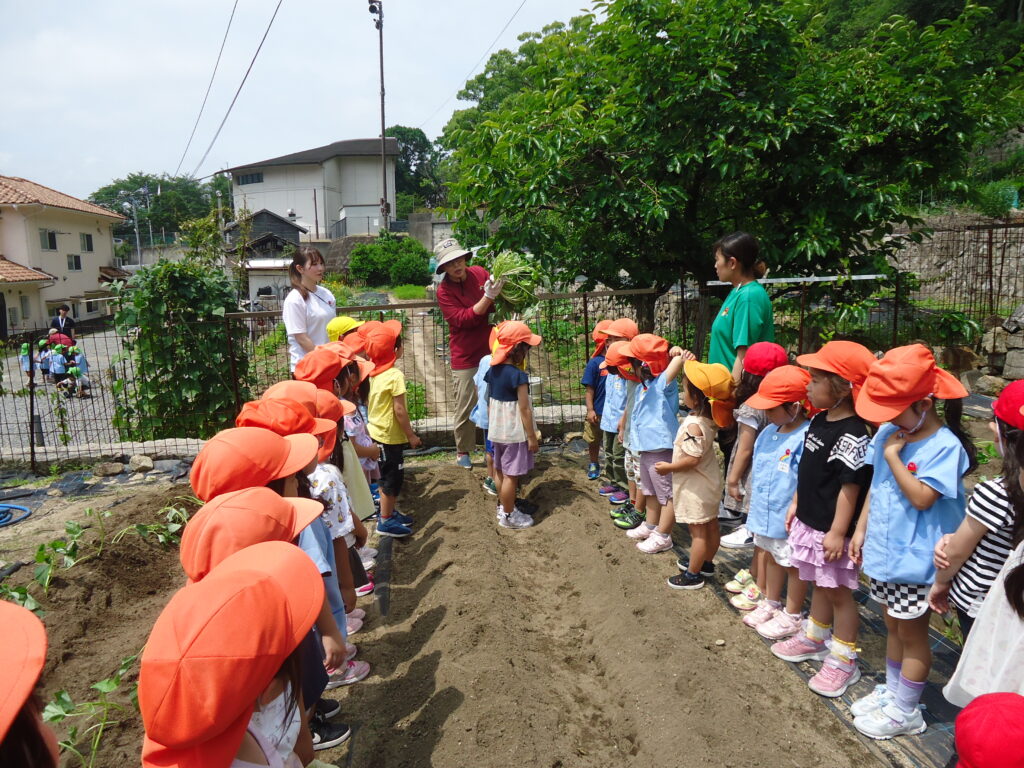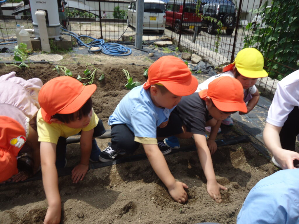 あぜ道では、枝豆やゴーヤが植えてあったり、溝には大きなダンゴムシを見つけたりと楽しい道中(笑)畑に着くとそこには2歳児組さんもいましたよ。