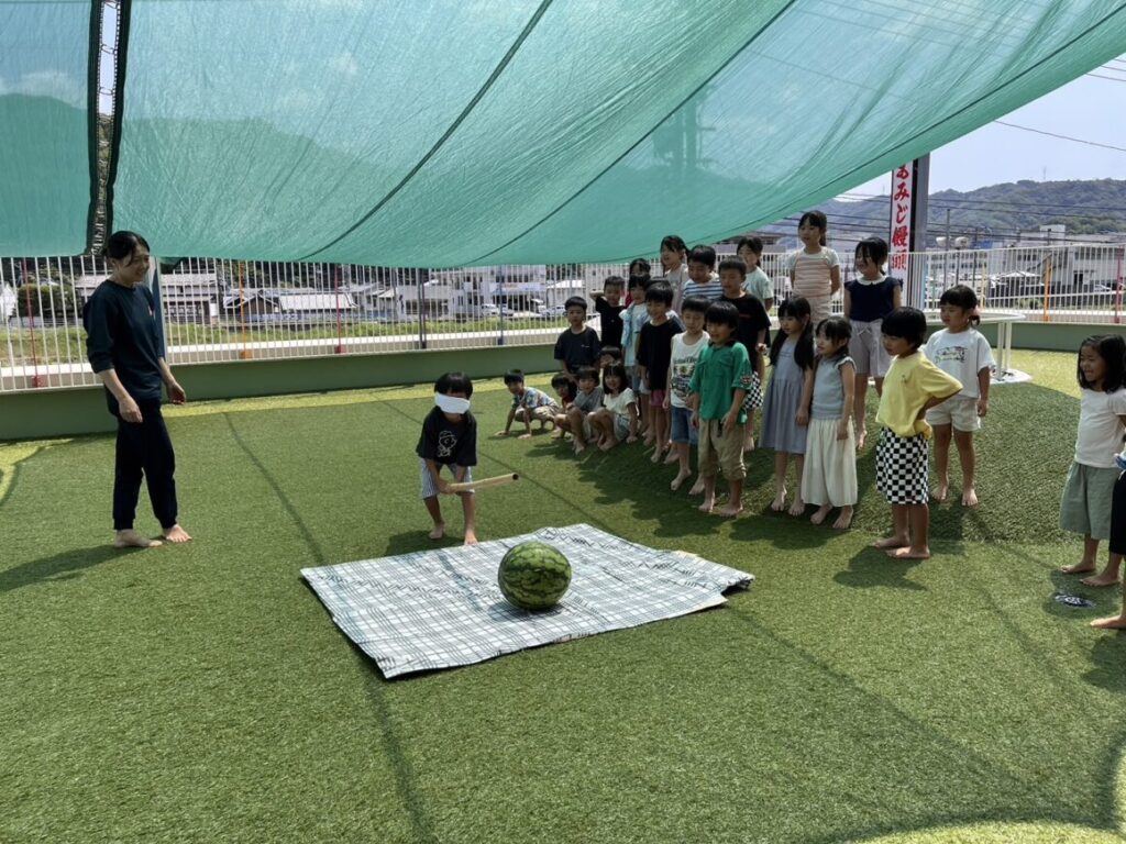 でも大きなスイカは中々割れず・・・・・(´;ω;`)最後は先生に託しみんなで応援!!すると見事にパッカーン✨✨とスイカが割れ👏👏🍉