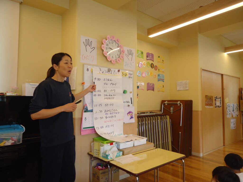 「今日の予定は・・・・・みんなでカレーを作ったり、2階園庭で水遊びしたり、すいか割りもするよ」と先生から聞いてみんなは大喜び!!4チームに分かれ、カレー作りに挑戦!!