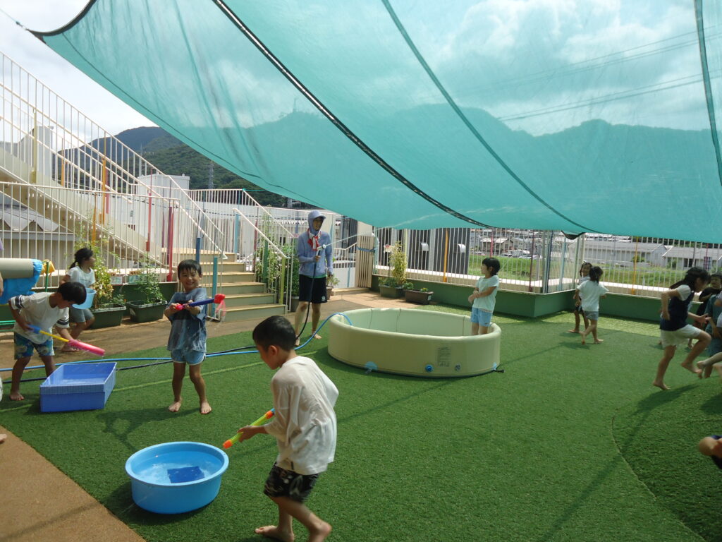 カレーの下準備が出来たら、後は園長先生にお願いして、みんなで水遊び💧水遊びも段々エスカレートし体中びしょ濡れ(笑)