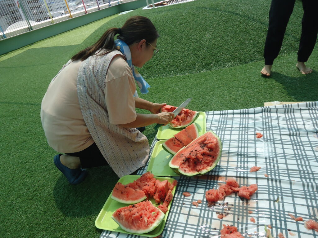 割れたスイカは園長先生が食べやすい大きさに切ってくれ、みんなで美味しく頂きました(⌒∇⌒)あっという間の時間で別れを惜しむ姿もみられましたが、思い出のアルバムを手に元気に帰っていった子ども達。体も心も大きくなっていて、すっかりお兄ちゃん、お姉ちゃんになっていました。✨✨少しの時間でしたが、みんなが揃い色々な思い出話がたくさんでき、楽しい1日となりました。