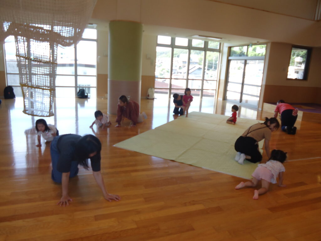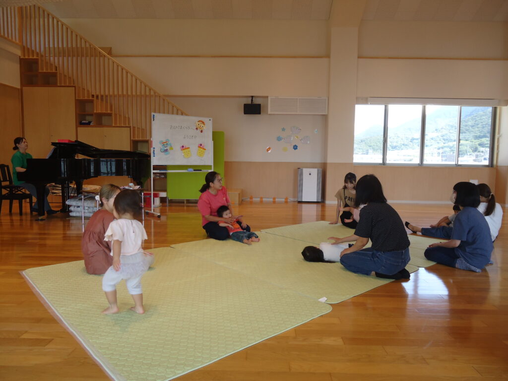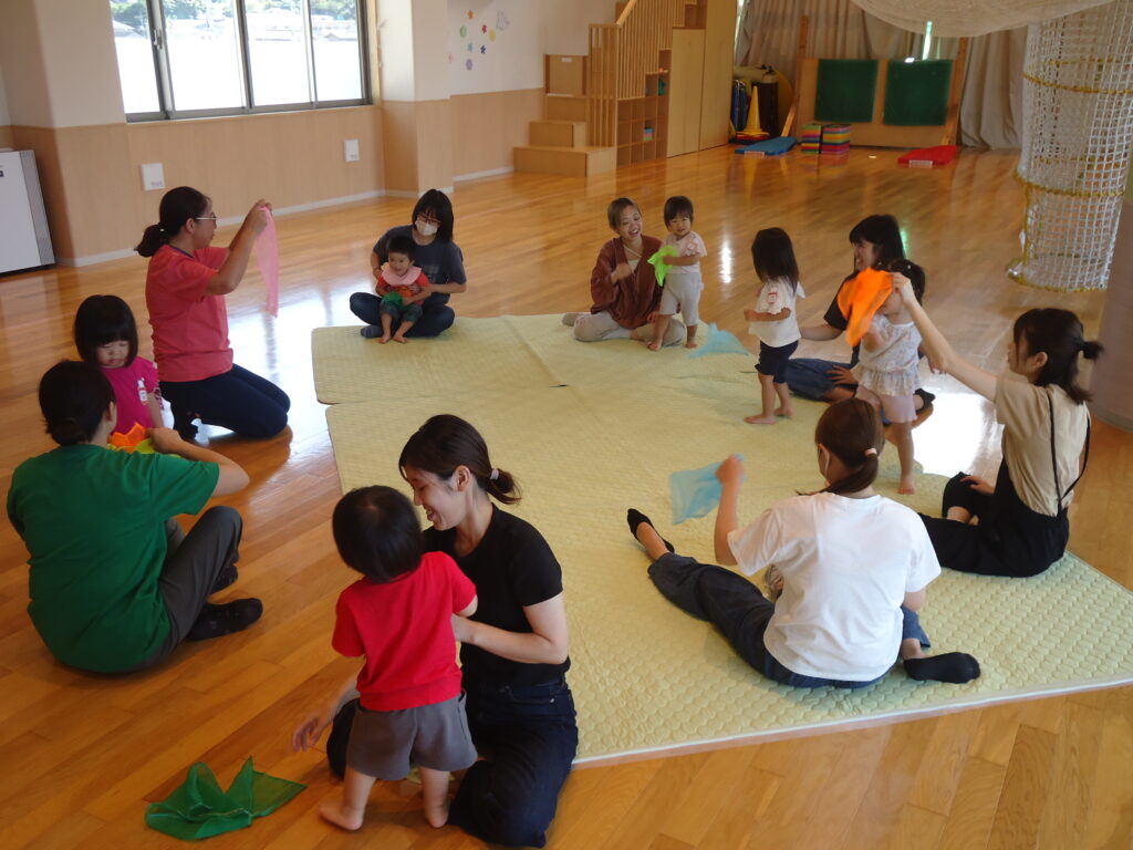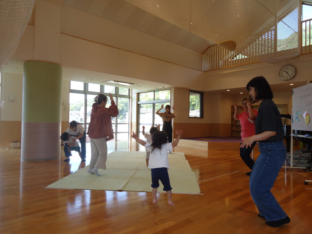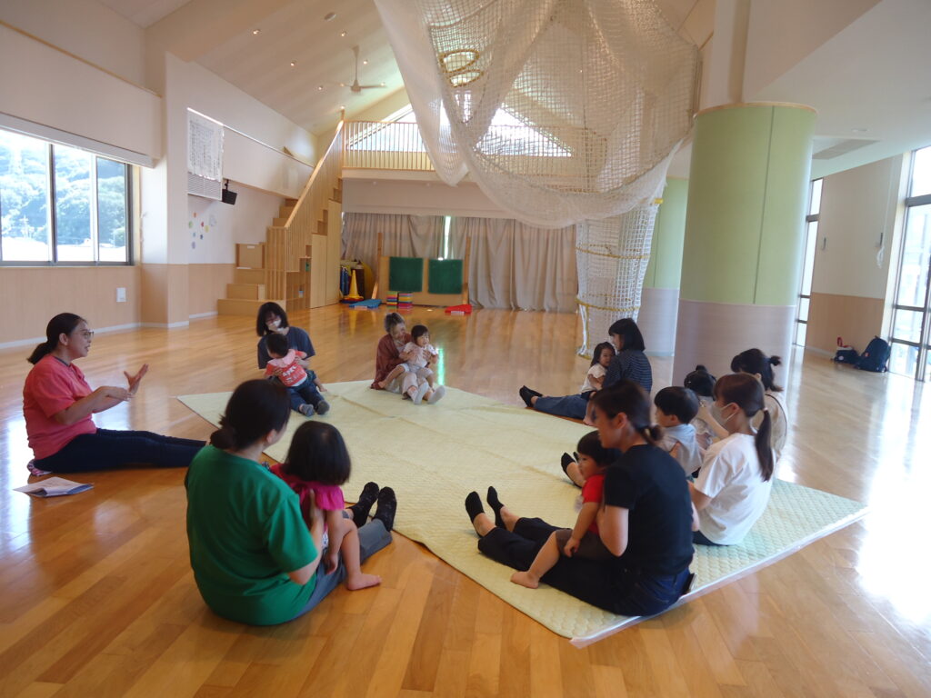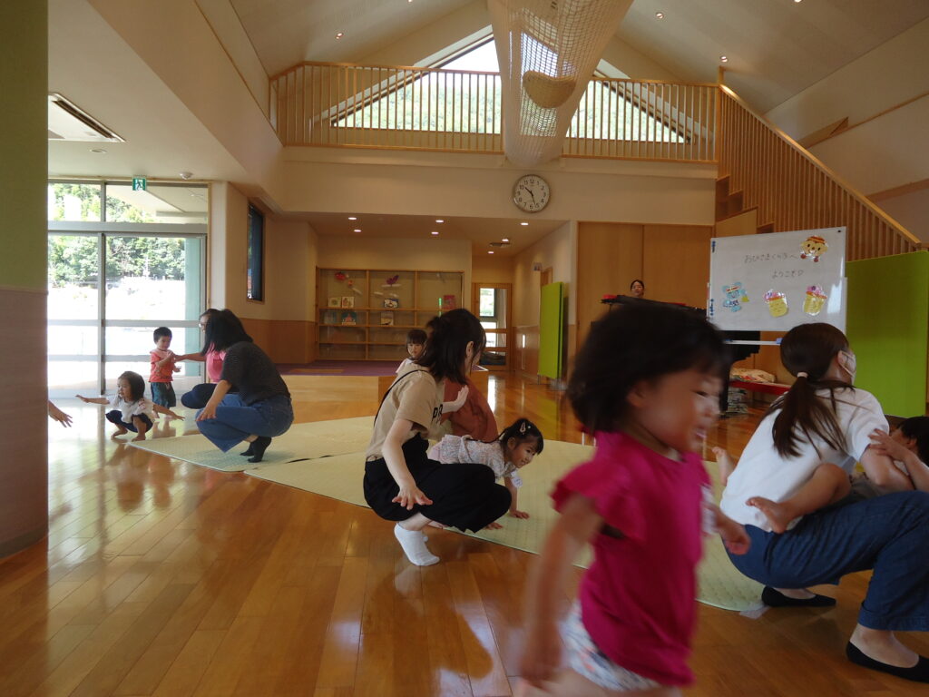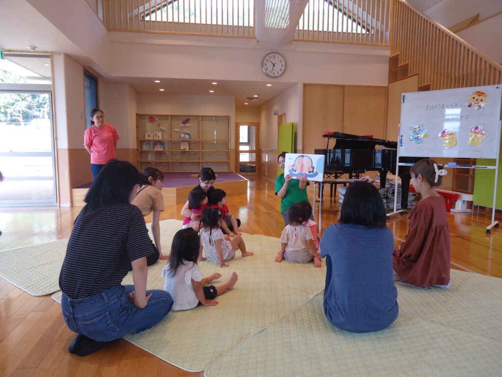 9月24日(火)10時~ホールで予約制の園庭開放「おひさまくらぶ」がありました。今月は体を動かして遊ぼう!!ということで、まず初めにわらべうたを歌いながら親子の触れ合い遊びをしましたよ。