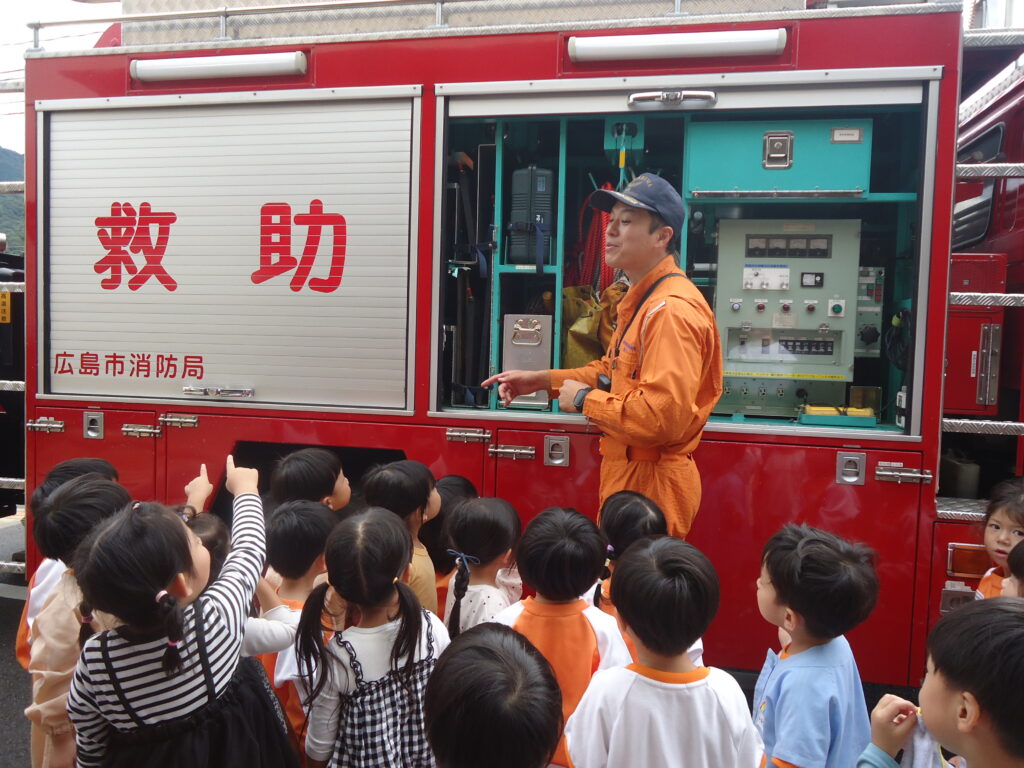 避難訓練の後は、各クラス、消防車の近くまでいき、色々な道具が乗っている工作車の説明を聞きました。