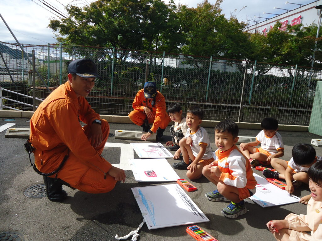 年長組さんは消防車を見た後、みんなで写生を!一生懸命描いてる姿に、消防士さんは「すごいね~!」 「頑張ってるね~!」と優しく声を掛けて下さいました💓