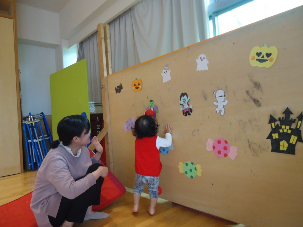 ハロウィンのキャラクターに向かっての玉投げは大喜びで、気に入ったキャラクターの近くまで行き、玉を投げていました(笑)