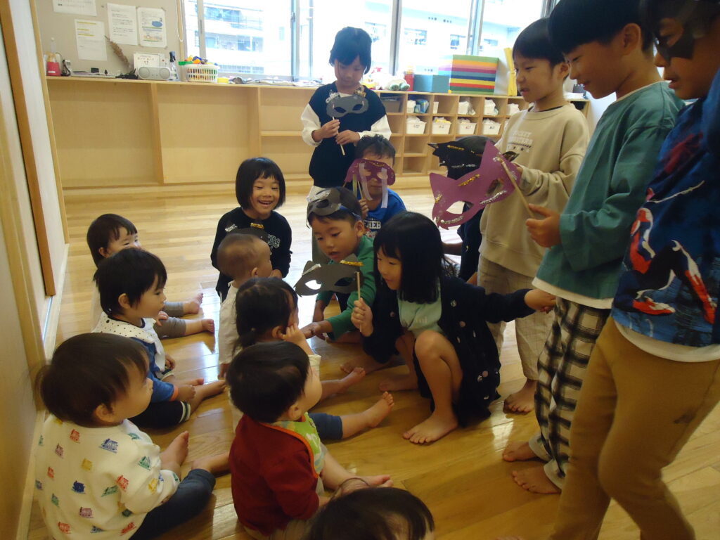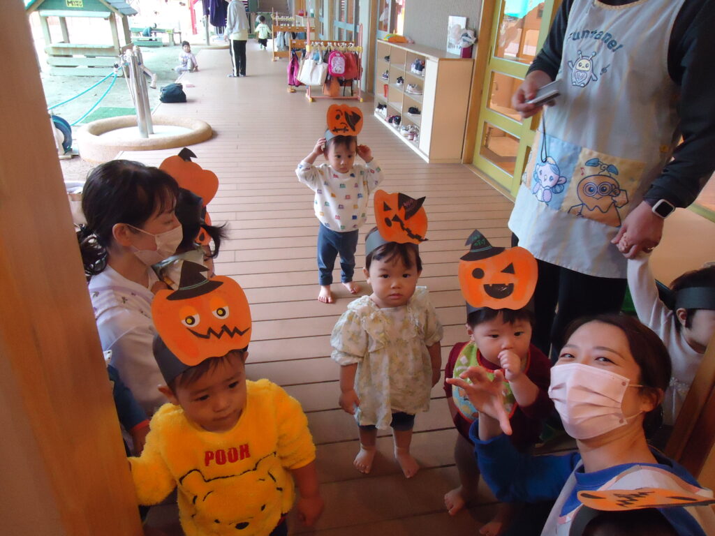 年長組さんは0歳児クラスにお邪魔して、ちょっぴり優しくハロウィン🎃(笑)小さいお友だちは何だろう??って不思議がいっぱい(笑)