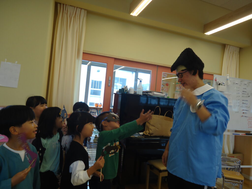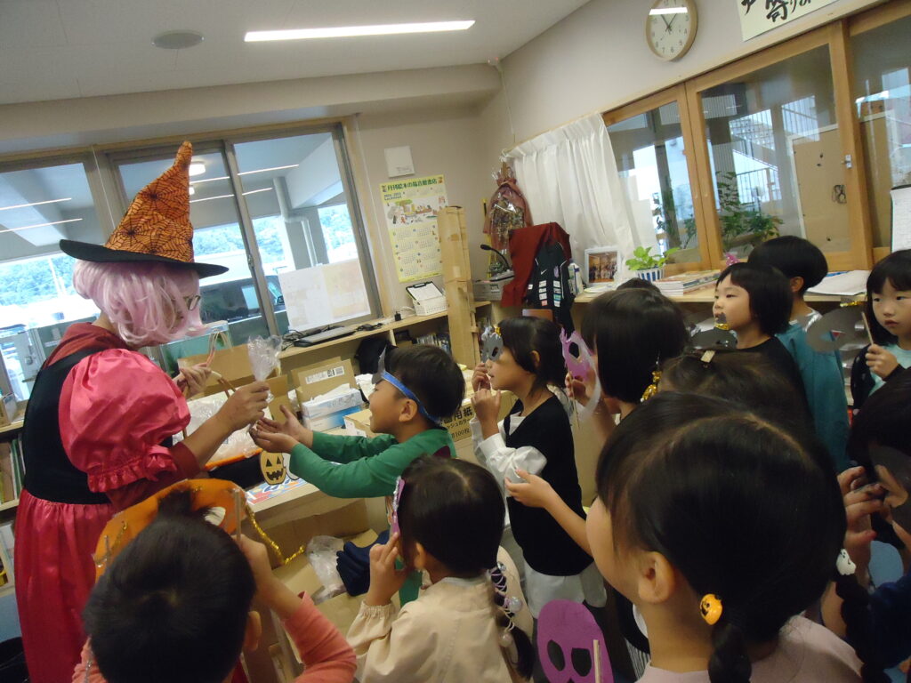 最後に年長児クラスのお友だちは「トリックオアトリート!!お菓子をくれなきゃ、いたずらするぞ~~~!!」と大きな声でお菓子をおねだり(笑)困った魔女さんは「いたずらしないでね‘~~~」(^^;)と一人ずつにお菓子をくれました🎃みんなで仮装して、ハロウィン🎃が楽しめた1日でした。