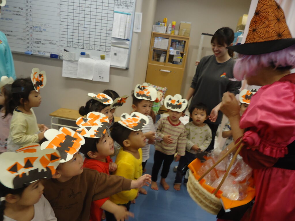 2歳児クラスは、お菓子をもらう為にドキドキしながらも「お菓子ちょうだい!」と頑張って言いましたよ(笑)