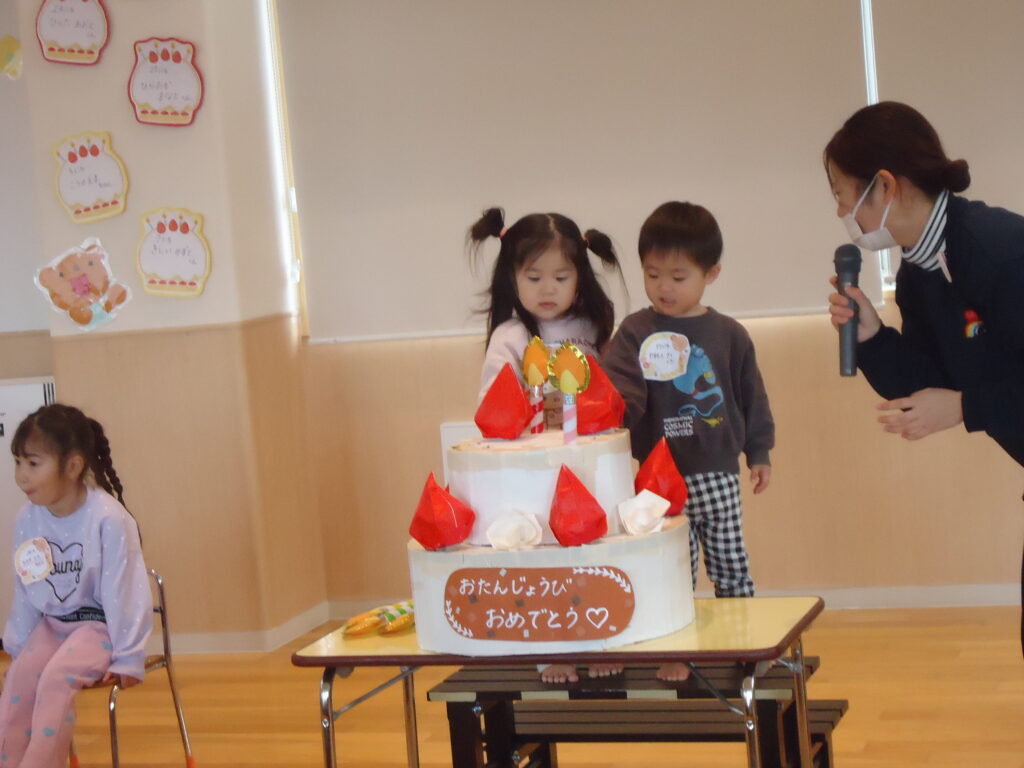 今月は0・1歳児クラスのお友だちはいなかったので、2歳歳児クラスのお友だちからケーキの前へ。お誕生日のろうそくが2本立つととってもうれしそうで、元気にお返事も出来ました。