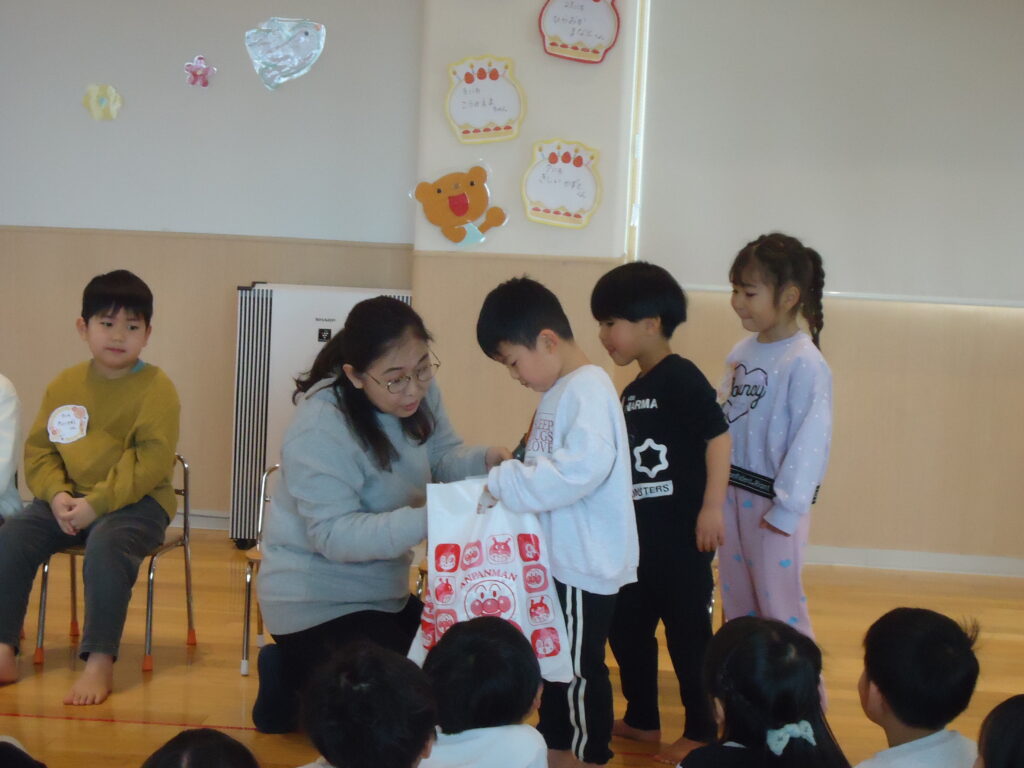 園長先生から、プレゼントをもらうと、元気な声で「ありがとう!」が言えました。(*^▽^*)さすが年中組さんですね。