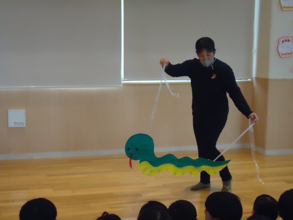 最後は十二支の話に出たキャストが出てごあいさつ✨✨とっても上手に出来ました。👏👏(*^▽^*)さぁ、この後は新年にふさわしいあるゲストが登場ですが、何やら次出てくる○○〇が気になって気になって・・・会場がざわついていると、