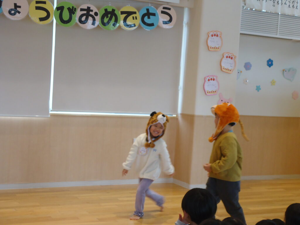 十二支のお話では、誕生児のお友だちが干支の動物に変身し次々登場!まずは牛さんとねずみさん(笑)モ~~~!🐄チュ~チュ~!🐭