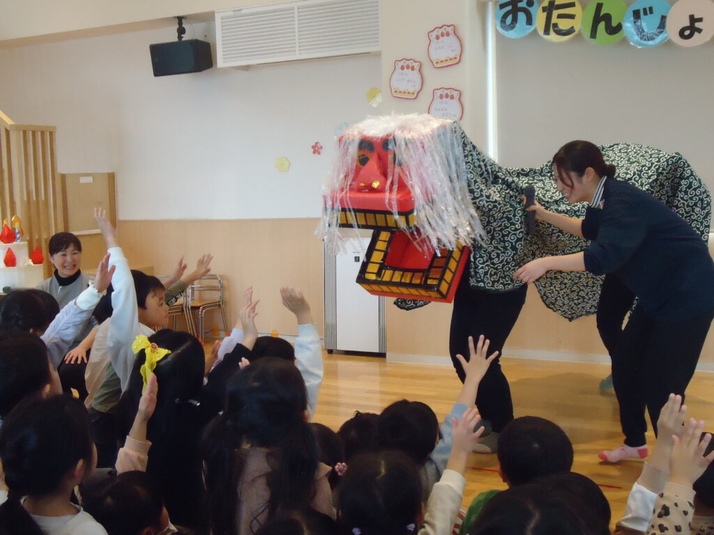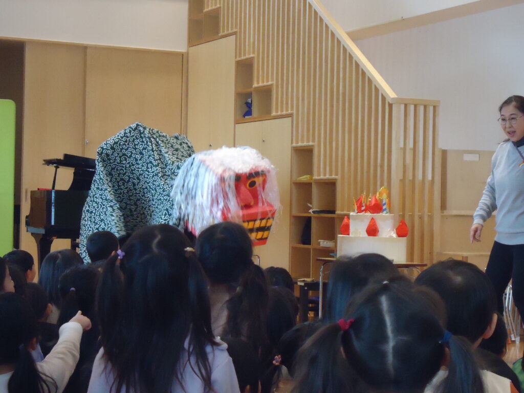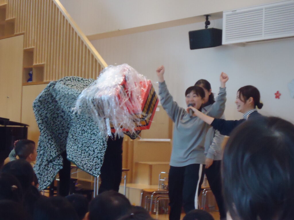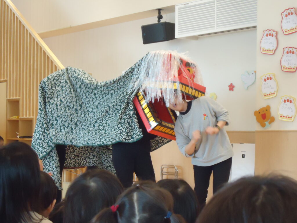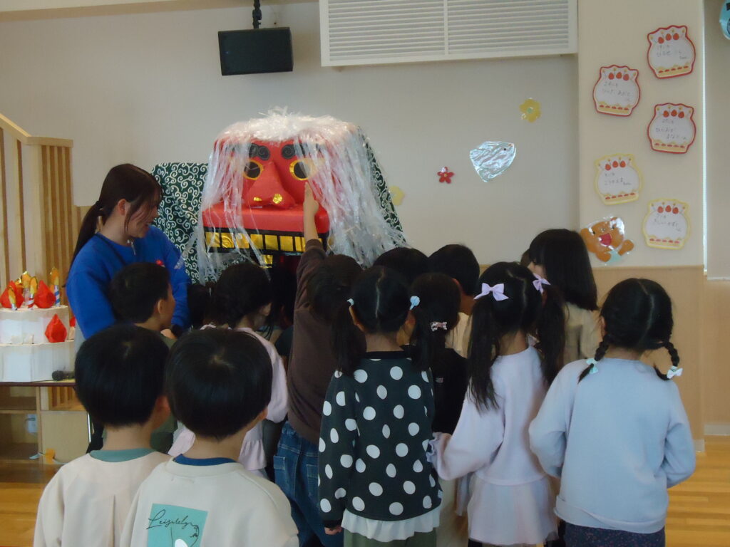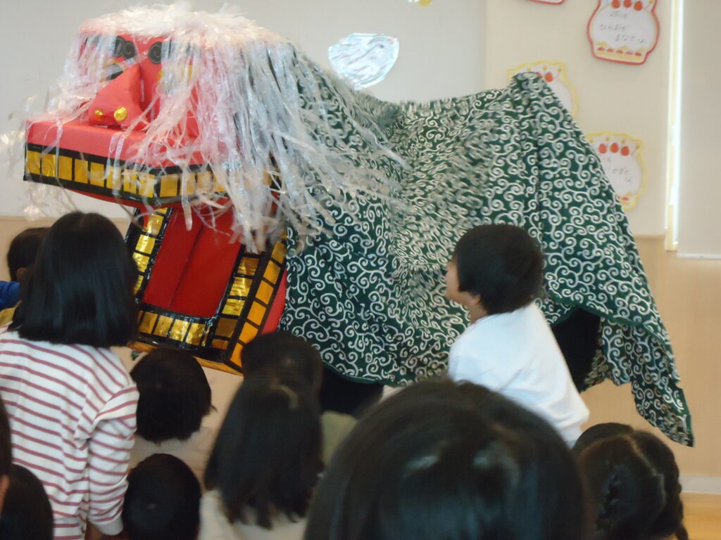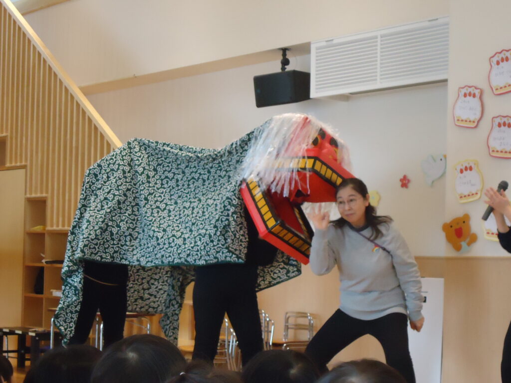 子ども達には獅子舞にガブリと噛んでもらうとその1年は病気にならずに健康に過ごせると伝えたものの、いざ、大きな口の獅子舞を見ると怖いので、先生たちがまずは見本を。(笑)