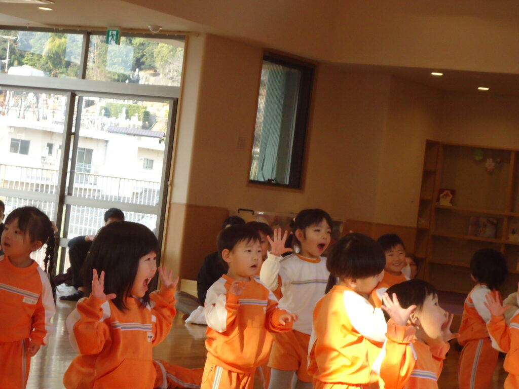 まずは年少組さんです。参観で保護者の方が見ているのにも関わらず、体育の先生の顔しっかり見て、真似っこしながら、しっかり体操していますよ。(*^▽^*)