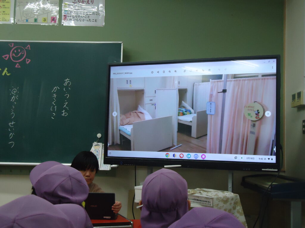 教室に入ると、1年1組の担任の先生とクラスのお兄ちゃんお姉ちゃんが笑顔で出迎えてくれ、早速、学校案内の発表が始まりました。