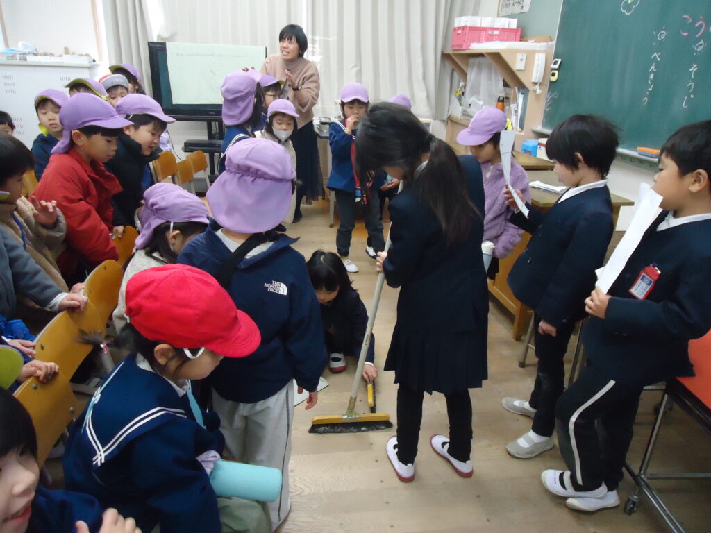 クラス内を掃除をする時のほうきの掃き方など、丁寧に教えてもらいきいぐみさんは自分達ですることにビックリ!!