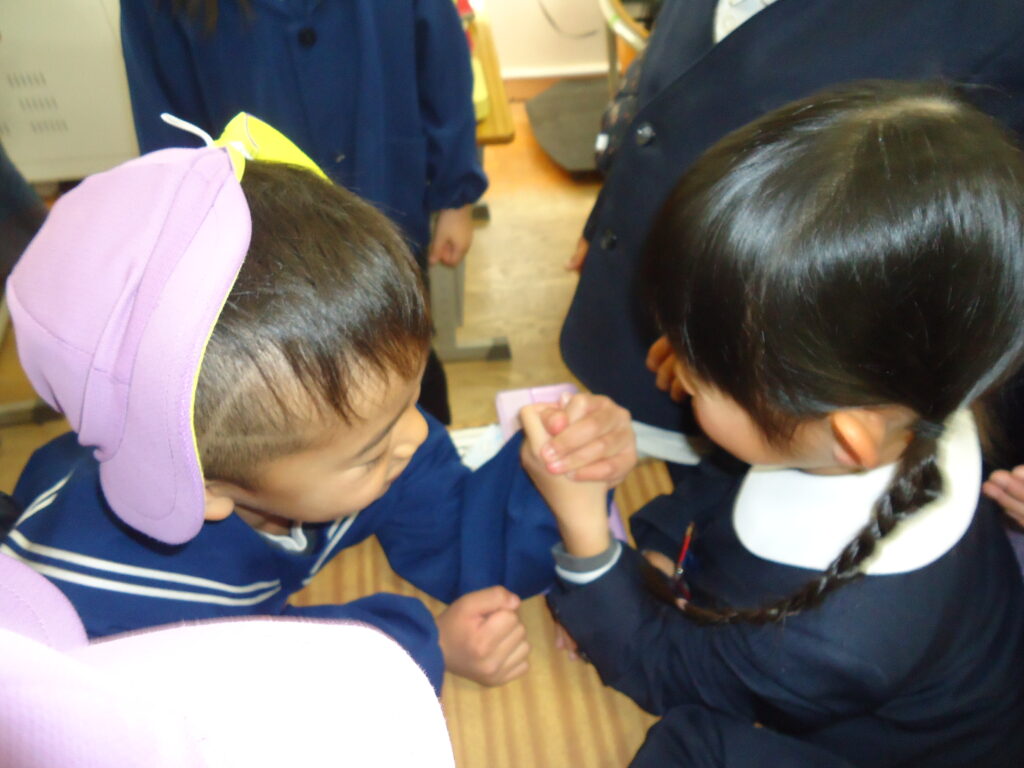 体操の後はペアになり、「なべなべそこぬけ」をしました。