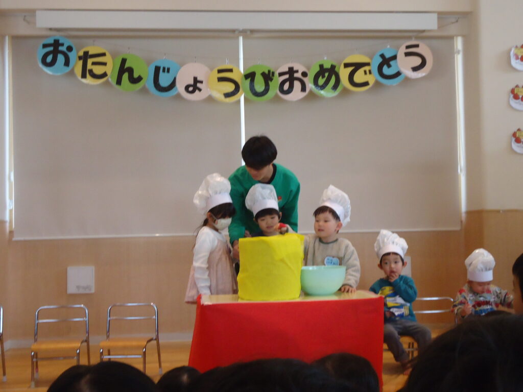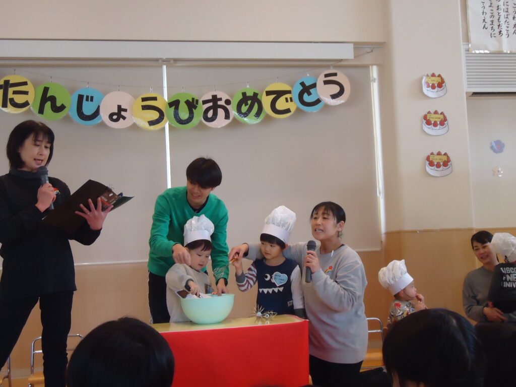 3本のろうそくに「ふ~~!」を上手にしたよ。色々ケーキ作りのお手伝いをして、楽しいお誕生日会でした。