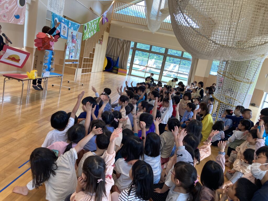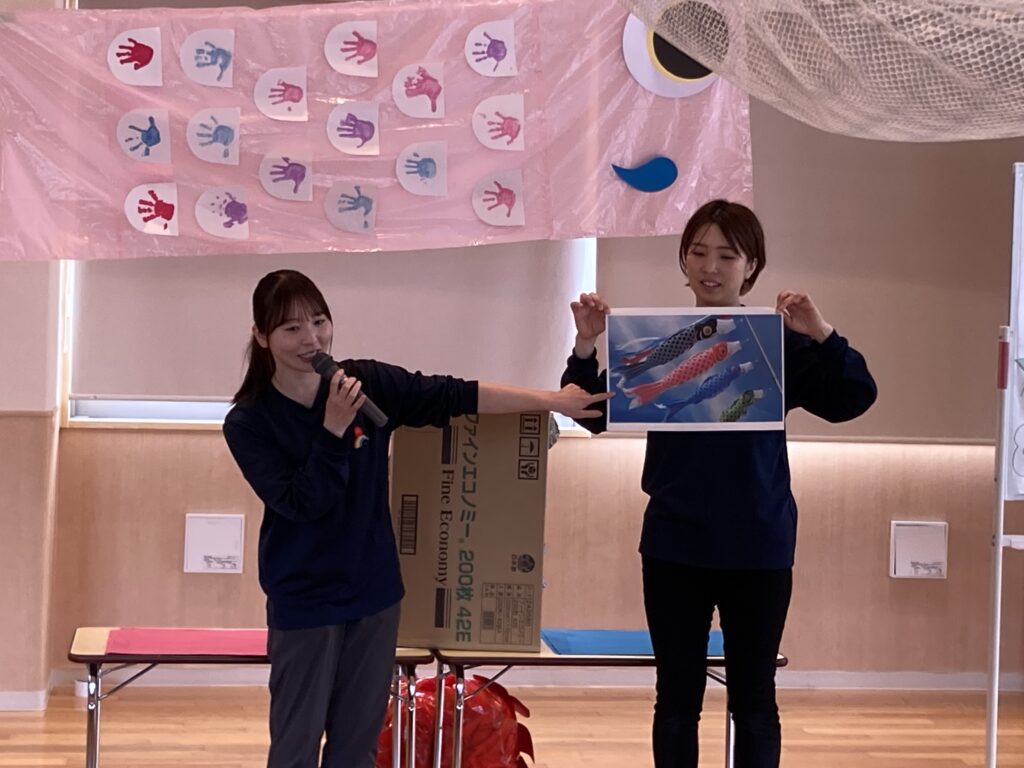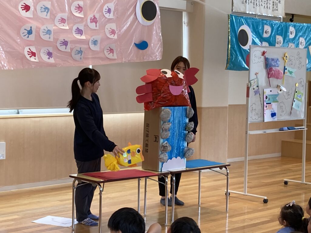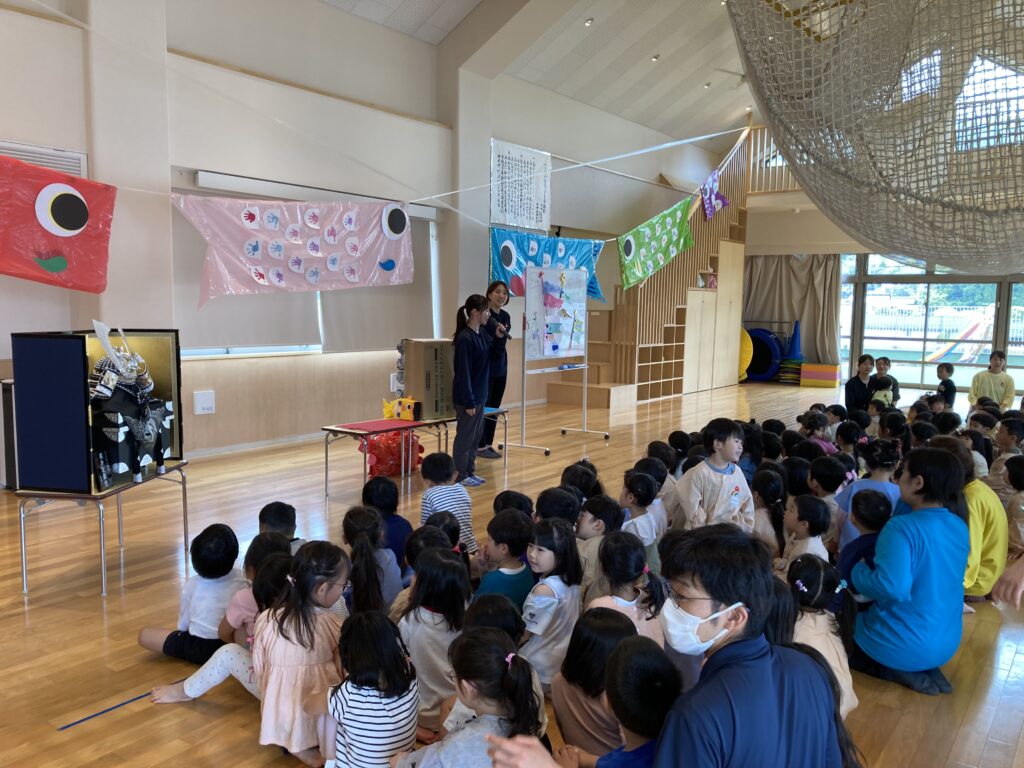 お話の中で、こどもの日に関してのクイズを考えたり、こいのぼりが滝を登っていく場面では、「がんばれ!!がんばれ!!」と、大きな声で応援したりして、楽しみました(*^^*)