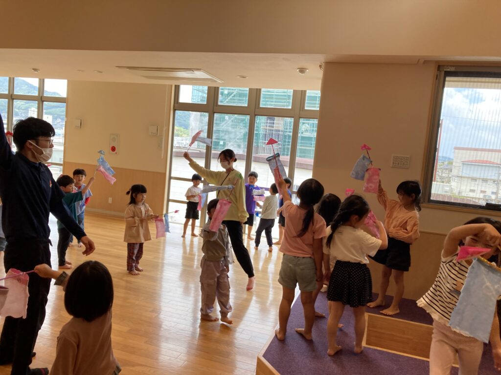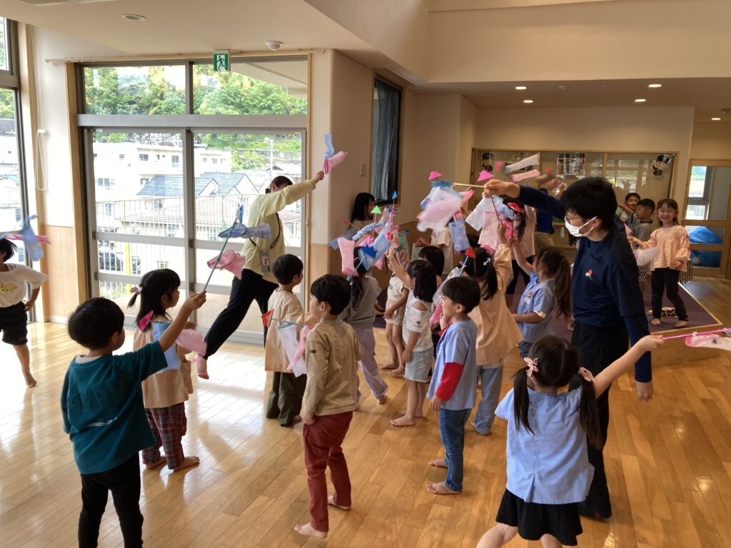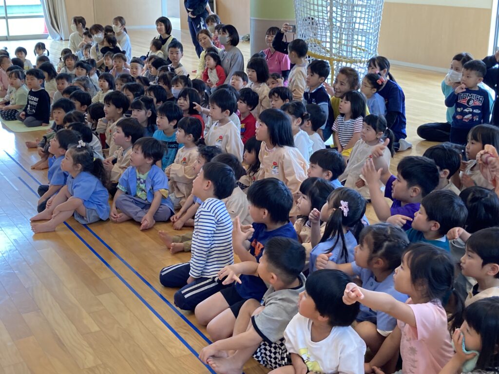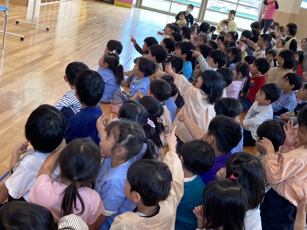 お話の中で、こどもの日に関してのクイズを考えたり、こいのぼりが滝を登っていく場面では、「がんばれ!!がんばれ!!」と、大きな声で応援したりして、楽しみました(*^^*)