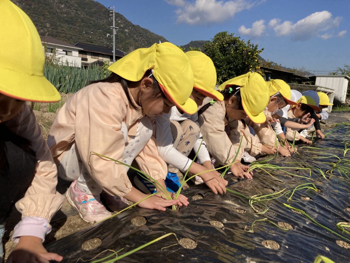 秋晴れの気持ち良い日に、もも組・あか組・きい組の3学年で、こうわ海田第二園の畑まで玉ねぎの苗植えに出かけまし…