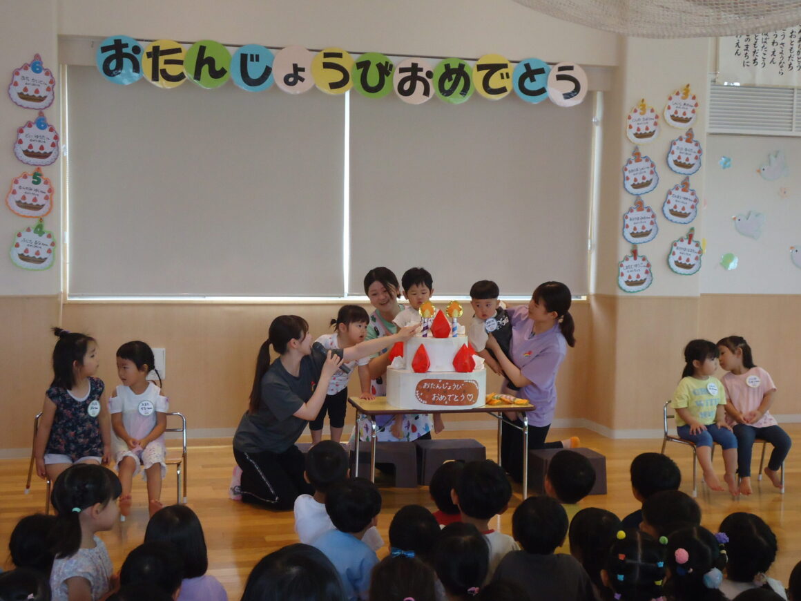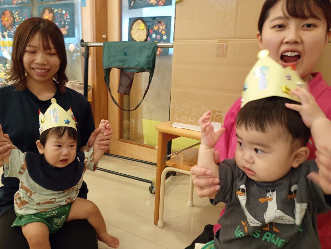 6月25日(火)10:00~ホールで6月のお誕生日会が行われました。 0歳児クラスのお友だちは担任の先生と一…