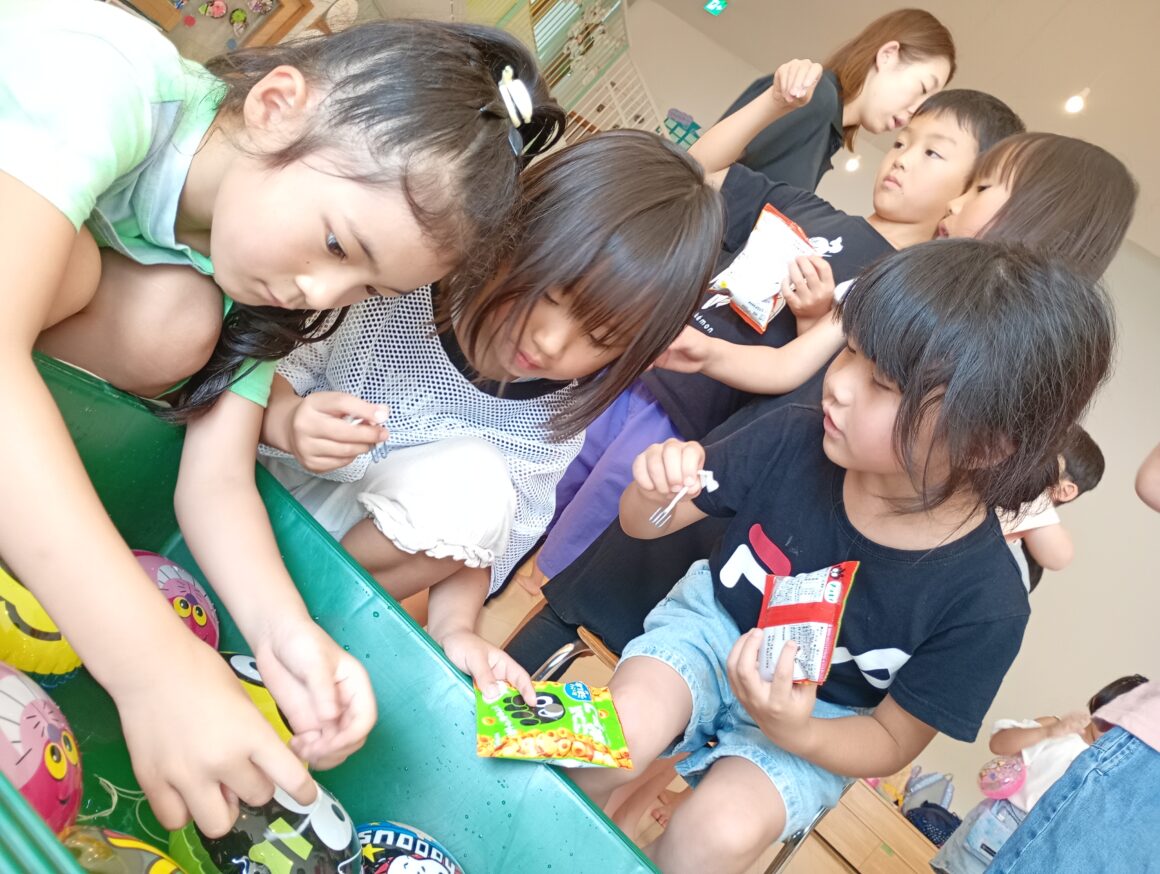 7月16日(火)にホールでお誕生日会がありました。あれあれ、いつも置いてない可愛いトンネルがありますね。今月…