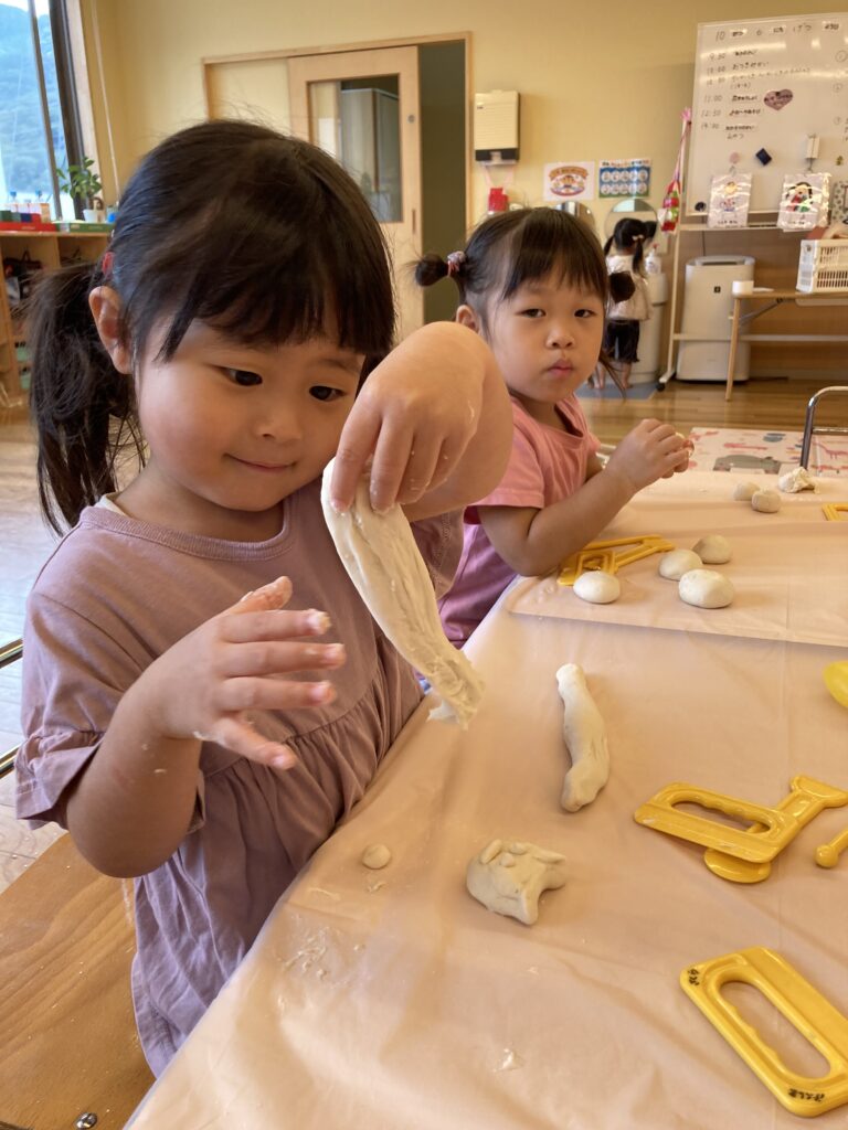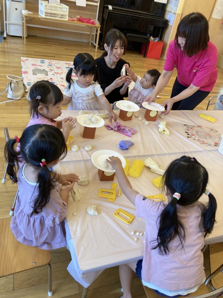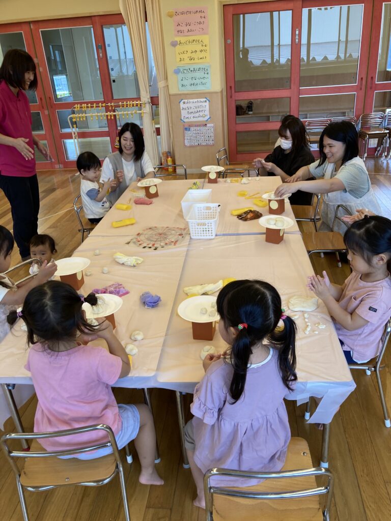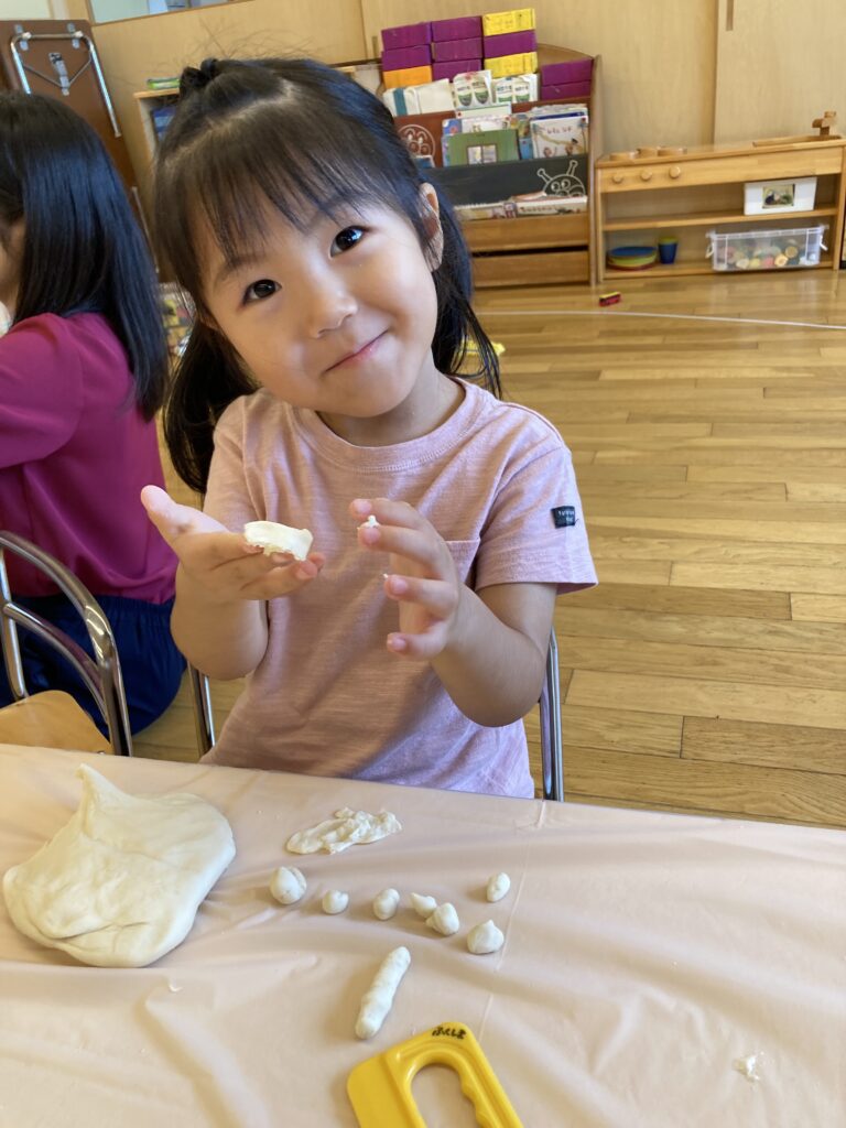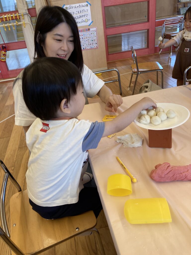 そのあとは、場所を移動して、小麦粉粘土で『お月見だんごづくり』を楽しみました。