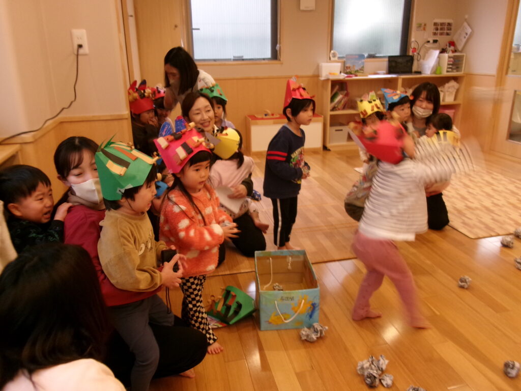 乳児クラスの子どもたちも、一生懸命に新聞紙豆を投げて追い払うことができました!!(^^)