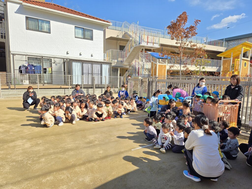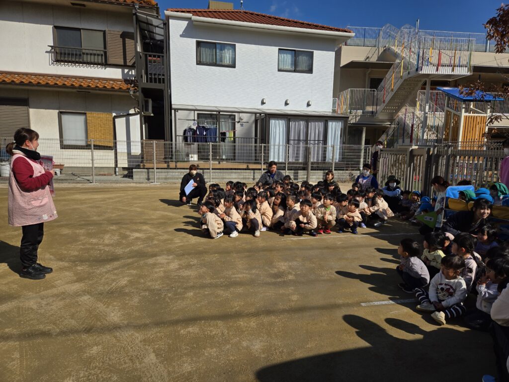 園庭に避難する時も、素早く逃げたり、担当の先生からのお話『おかしもち』の話もしっかり聞いていましたよ☆