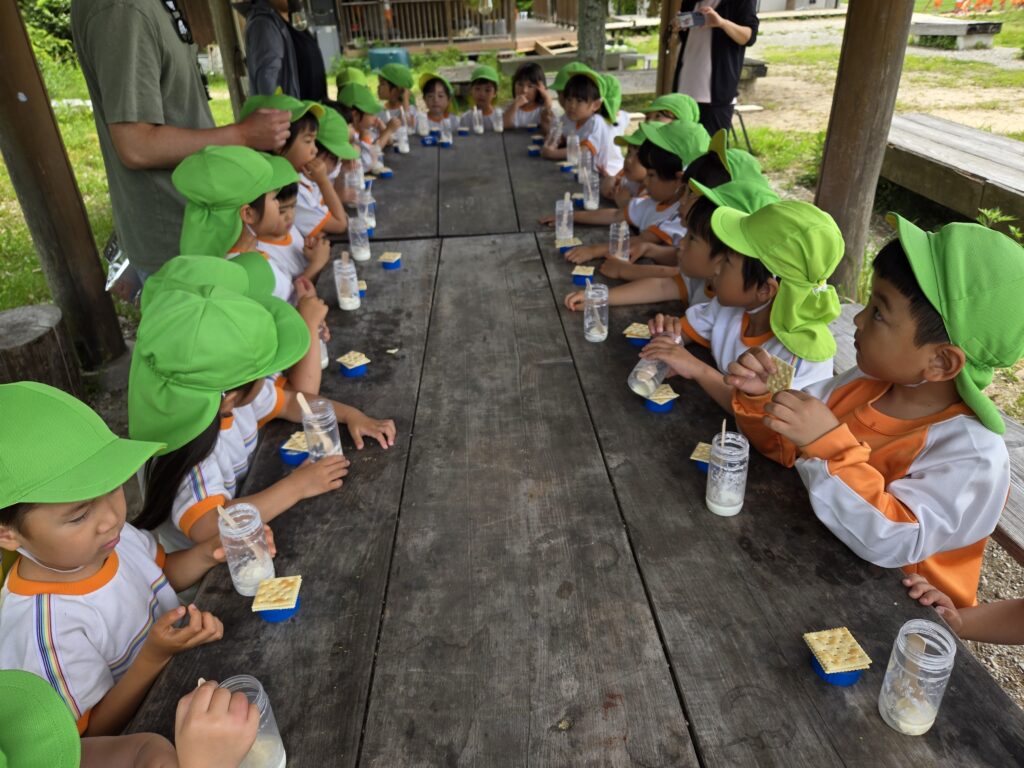 出来上がった容器の中で、残った牛乳を『残っているのは、バター牛乳だから先に飲んでごらん』と久保ちゃんに言っていただいて飲んでいた子どもたち。初めて飲んだ子どもがほとんどでしたが、「おいし~」と言っていました。その後も、バターをクラッカーにつけて美味しそうに食べていました☆(*^-^*)