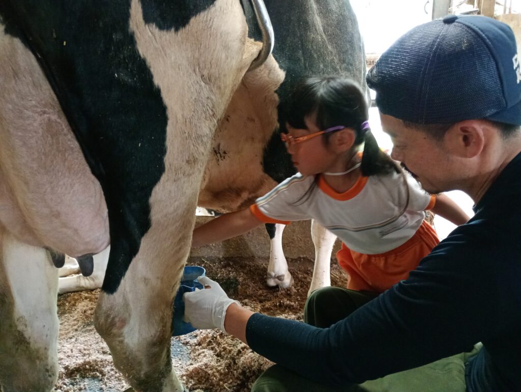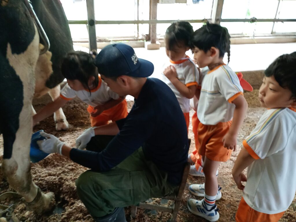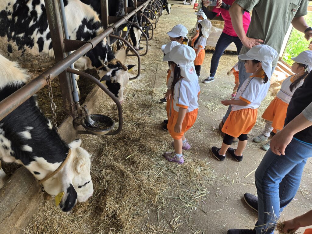 きい組は乳搾り体験、あか組はバター作り体験、もも組はエサやり体験をさせていただきました。