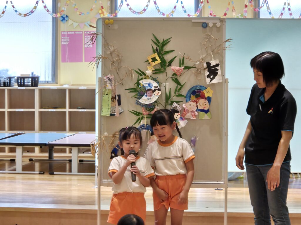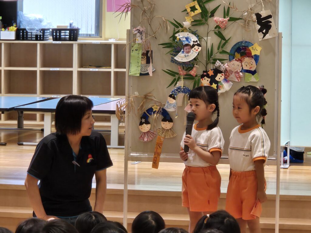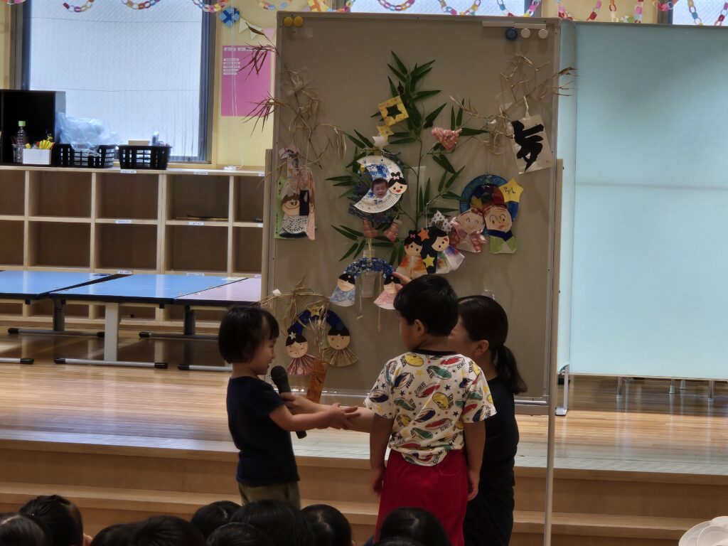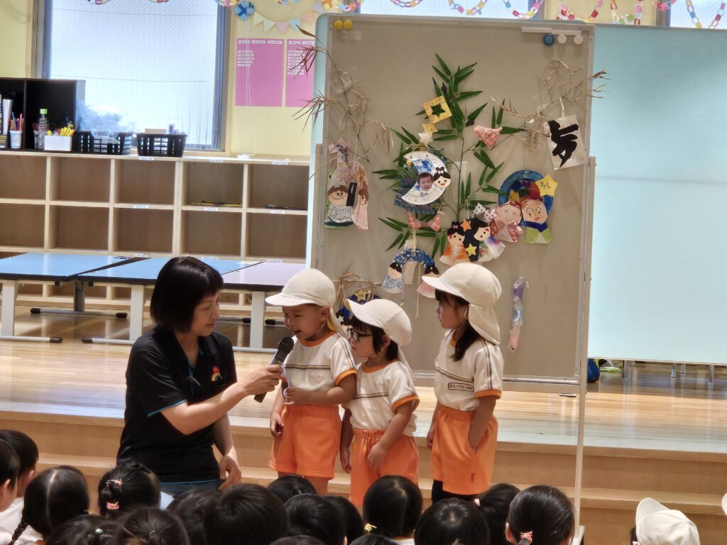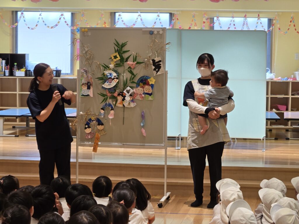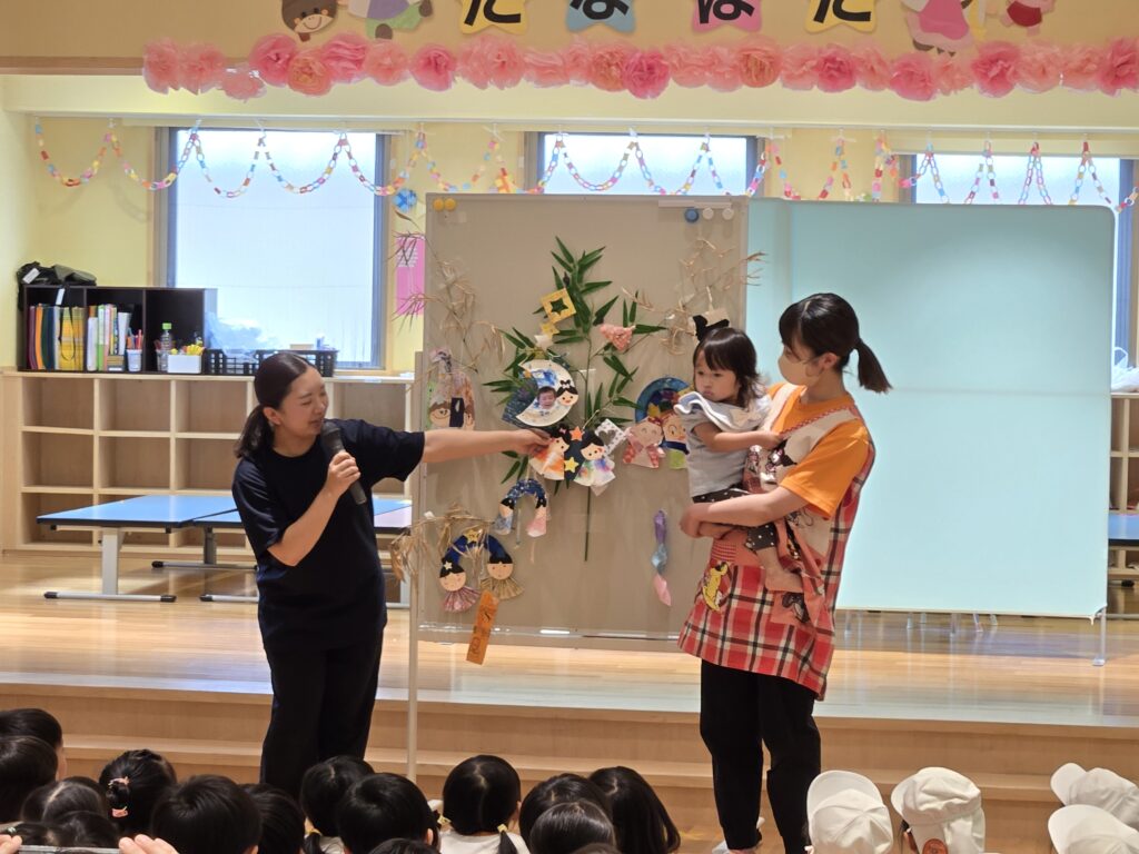 先生たちからの出し物は、七夕のお話でした。ステキな織姫と彦星が登場すると、子どもたちからは「〇〇先生!」と☆