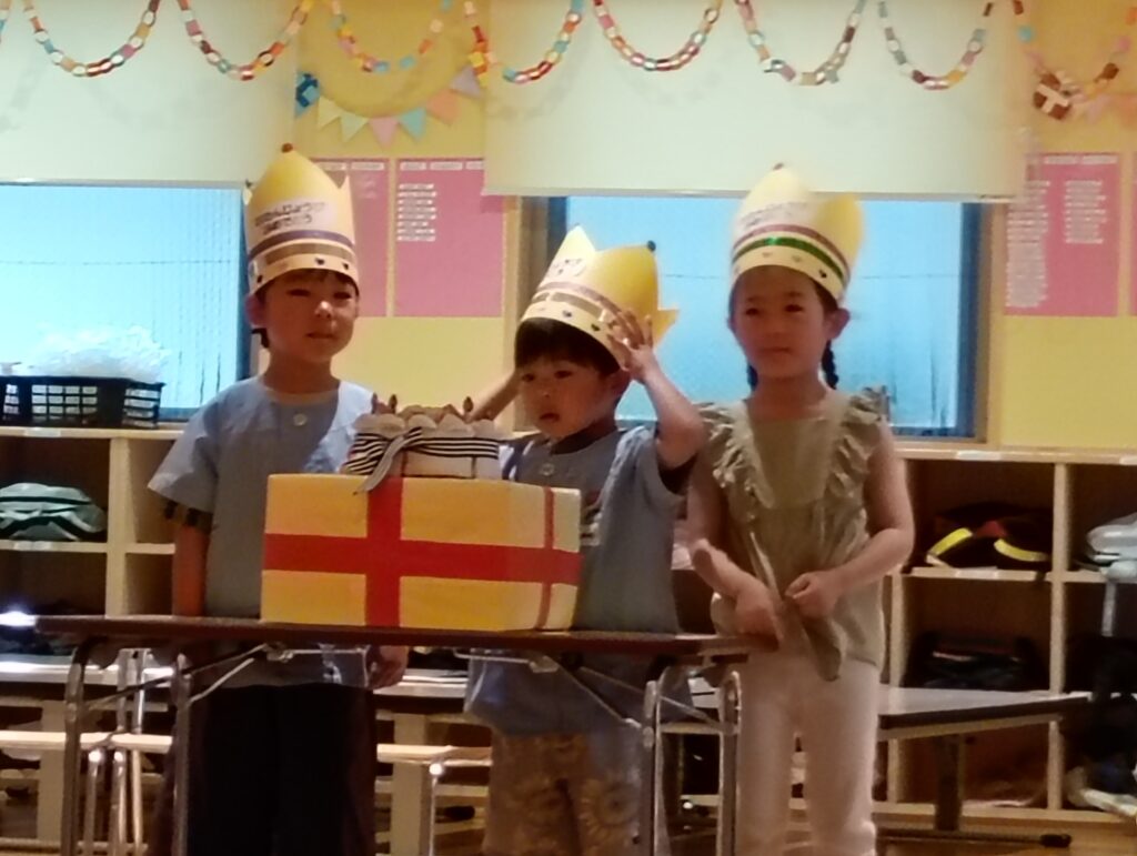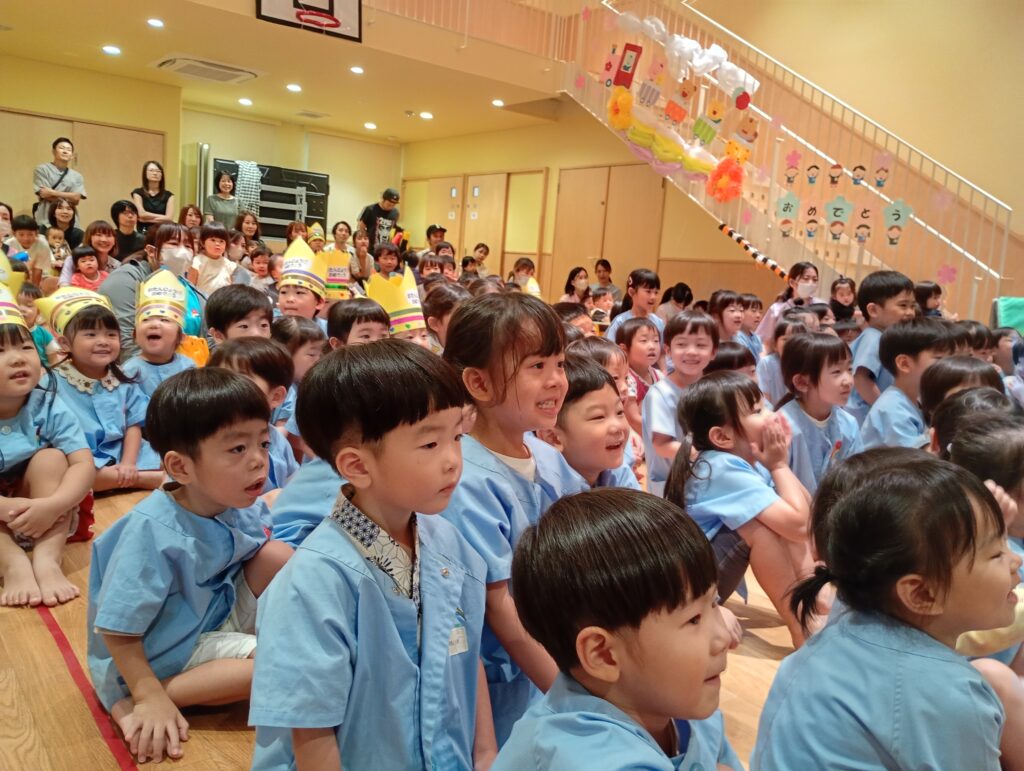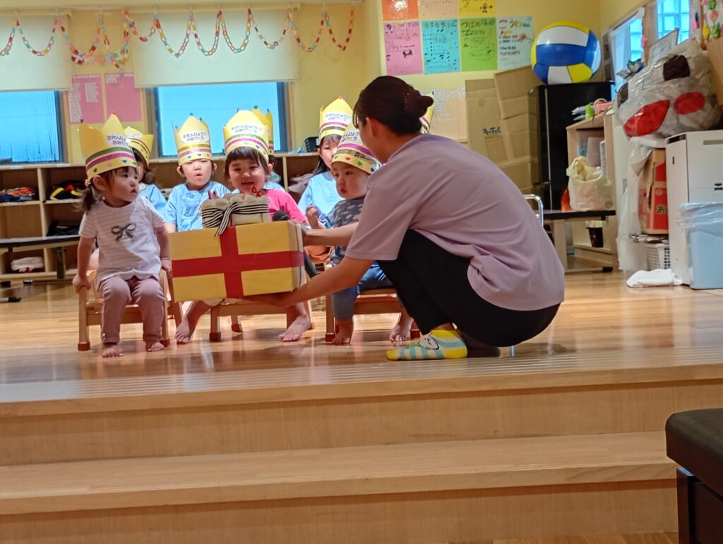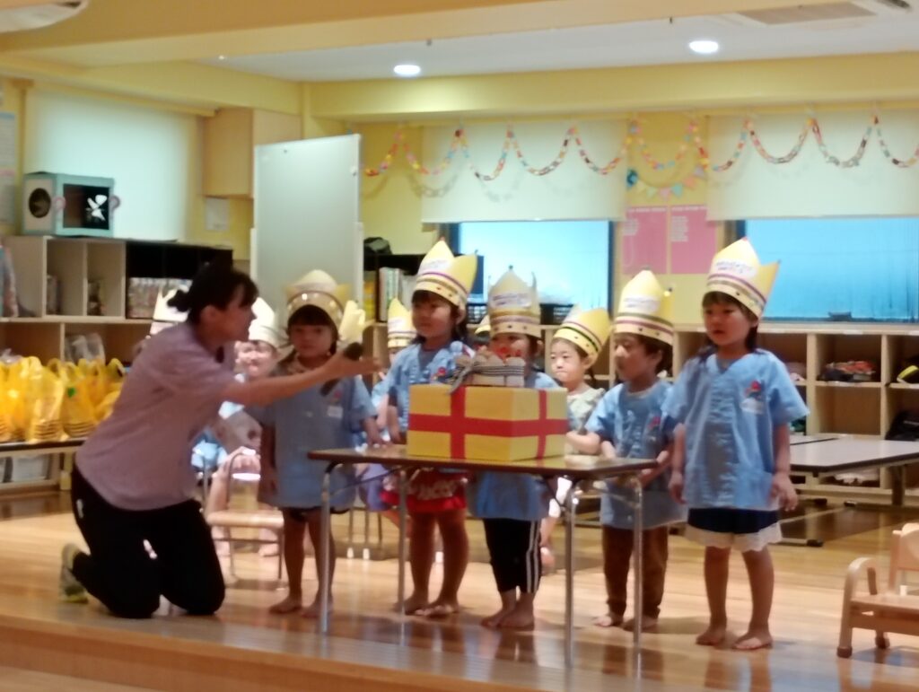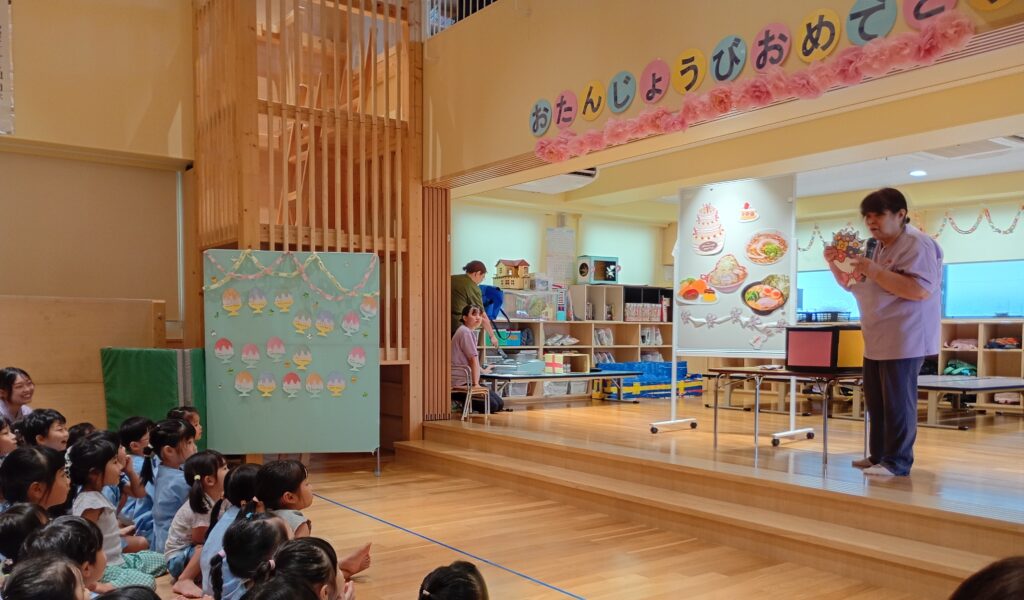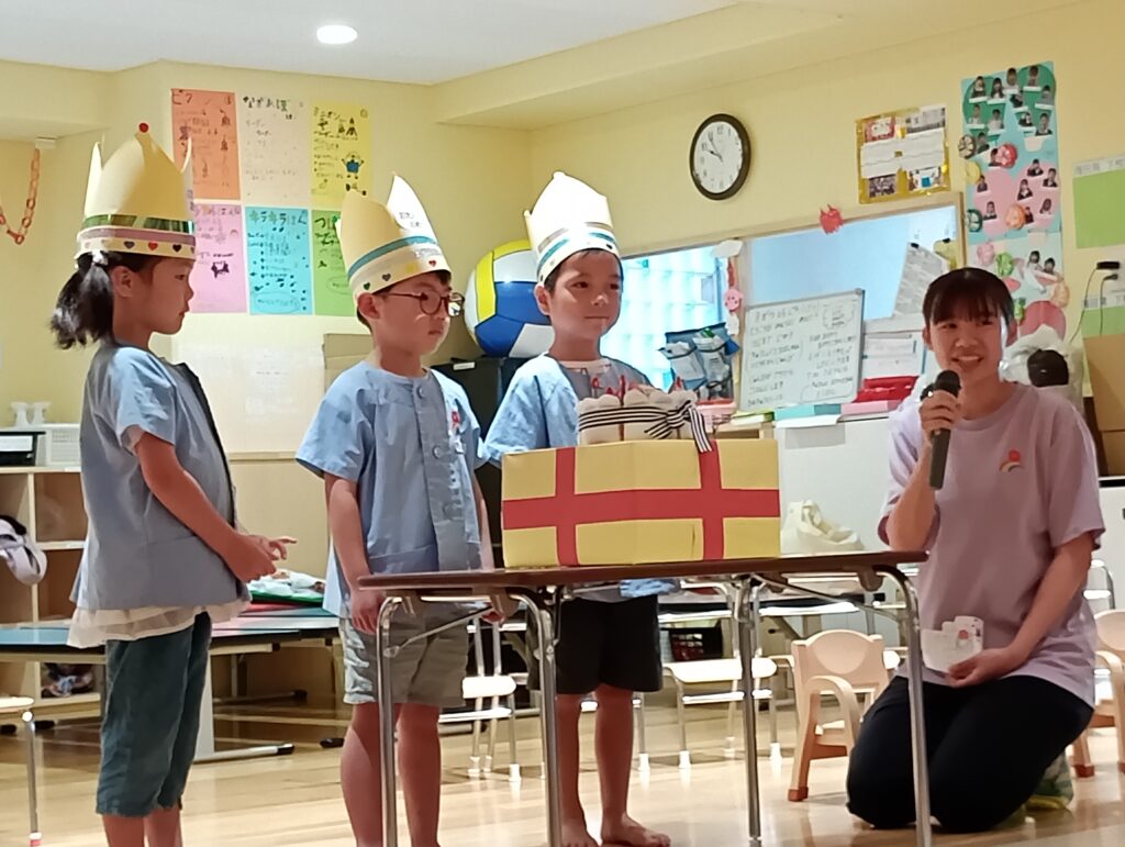 8月26日(火)に、8月のお誕生日会がありました。夏休み中の登園日ということもあり、一部のお友だちの中に、は久しぶりに会うお友だちもいましたよ☆(*’▽’)