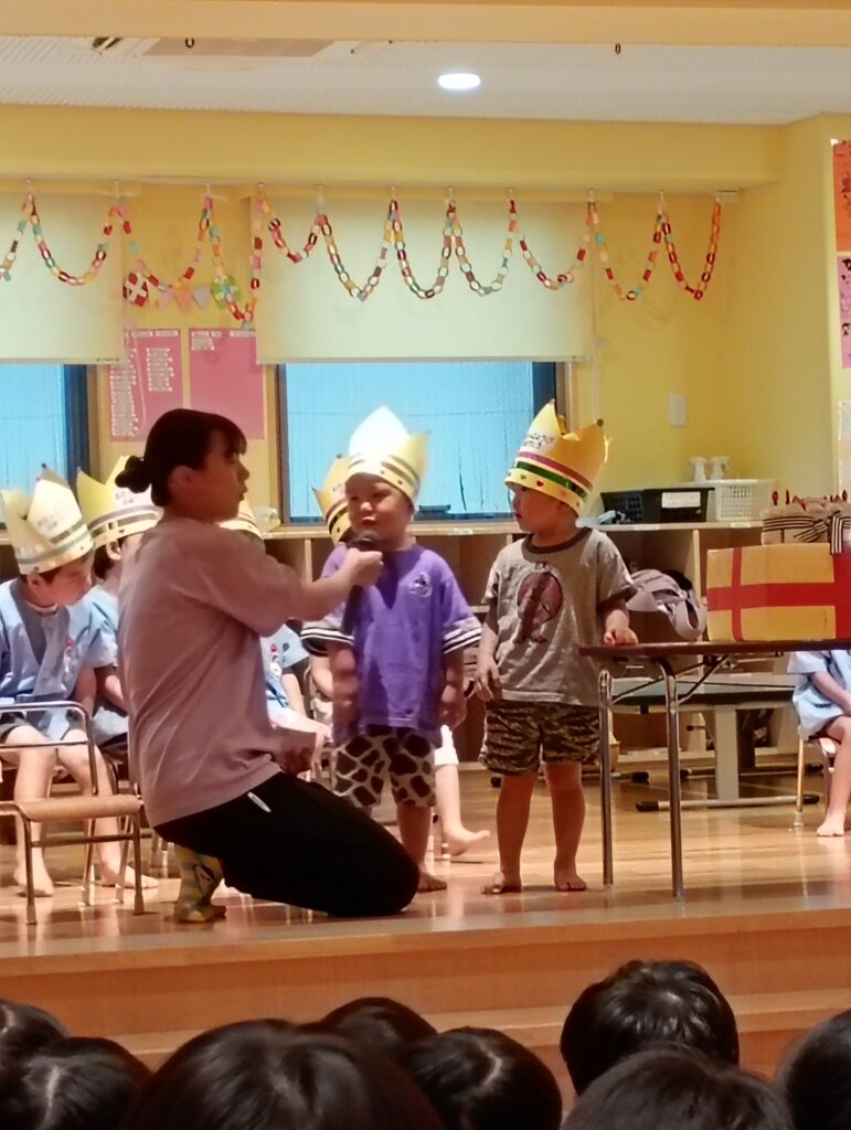 担当の先生から、「お名前と年齢」の質問と、「大きくなってなりたいもの」「好きなあそび」「好きな食べ物」などの質問がありました。