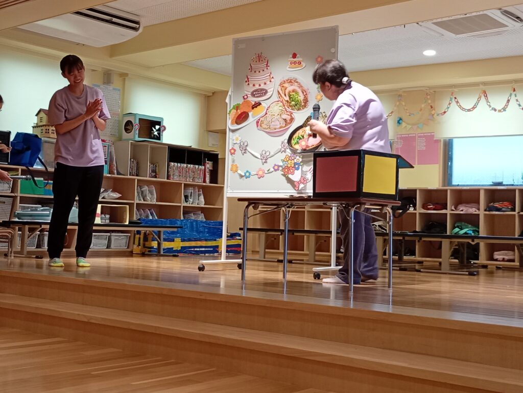 先生からの出し物では、「ちちんぷいぷい♪」と魔法のステッキで声を掛けると箱から好きな物が色々出てきて…。