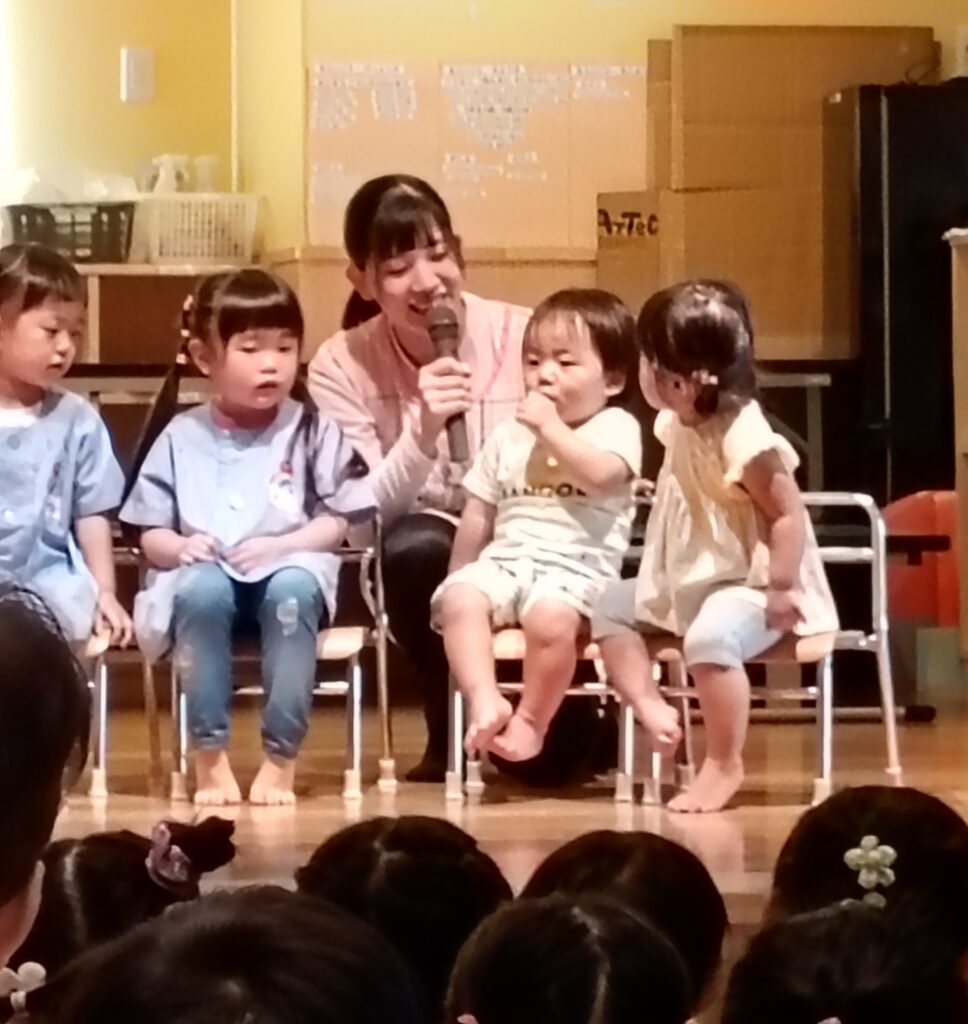 乳児クラスのお友だちは、少し恥ずかしくて…でしたが、先生が好きな食べ物を「何でも食べれます」「白いご飯が好きです」と教えてくれました。