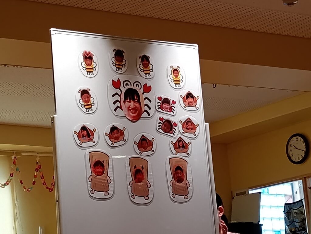 きい組さんは、自分で「好きな〇〇を決めて発表する」と決めたようで、「好きなキャラクター」や「好きな食べ物」「好きな人」を上手に発表していました。⇒好きなキャラクターは、コギャル・シナモンロール 好きな食べ物は、マスカット・バナナ 好きな人は、鬼滅の刃の無一郎さんと答えていました。