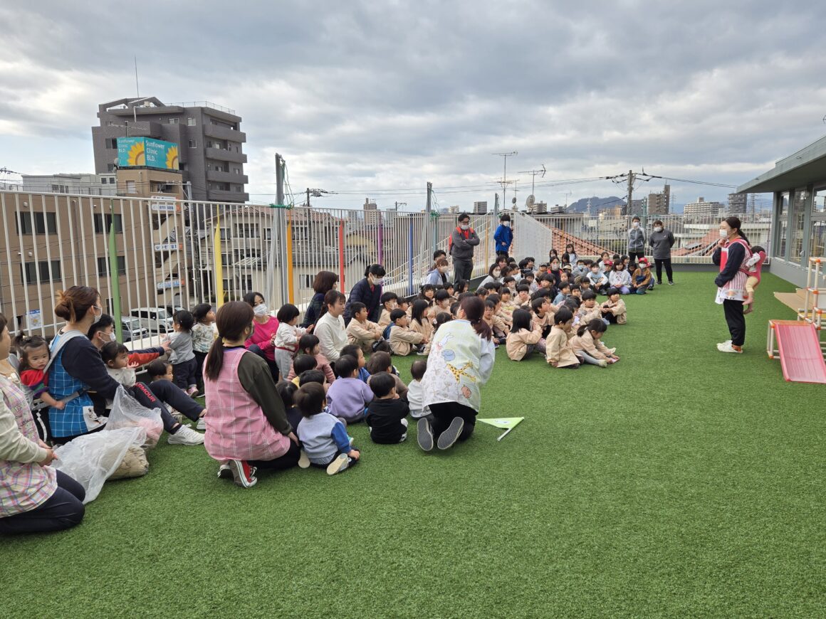 12月26日(木)に、地震の避難訓練を行いました。 今回は、津波も到達する予定なので屋上園庭に避難です。 園…